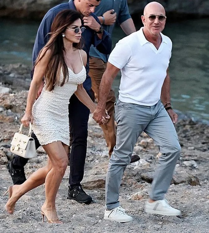 Lauren Sánchez si zvolila krémové minišaty, ktoré zvýrazňovali jej postavu, doplnené ladiacou kabelkou a priehľadnými podpätkami. Bezos zvolil jednoduchý štýl v bielom polo tričku, sivých nohaviciach a bielych teniskách a držal Lauren za ruku, keď sa spolu vracali na jachtu.