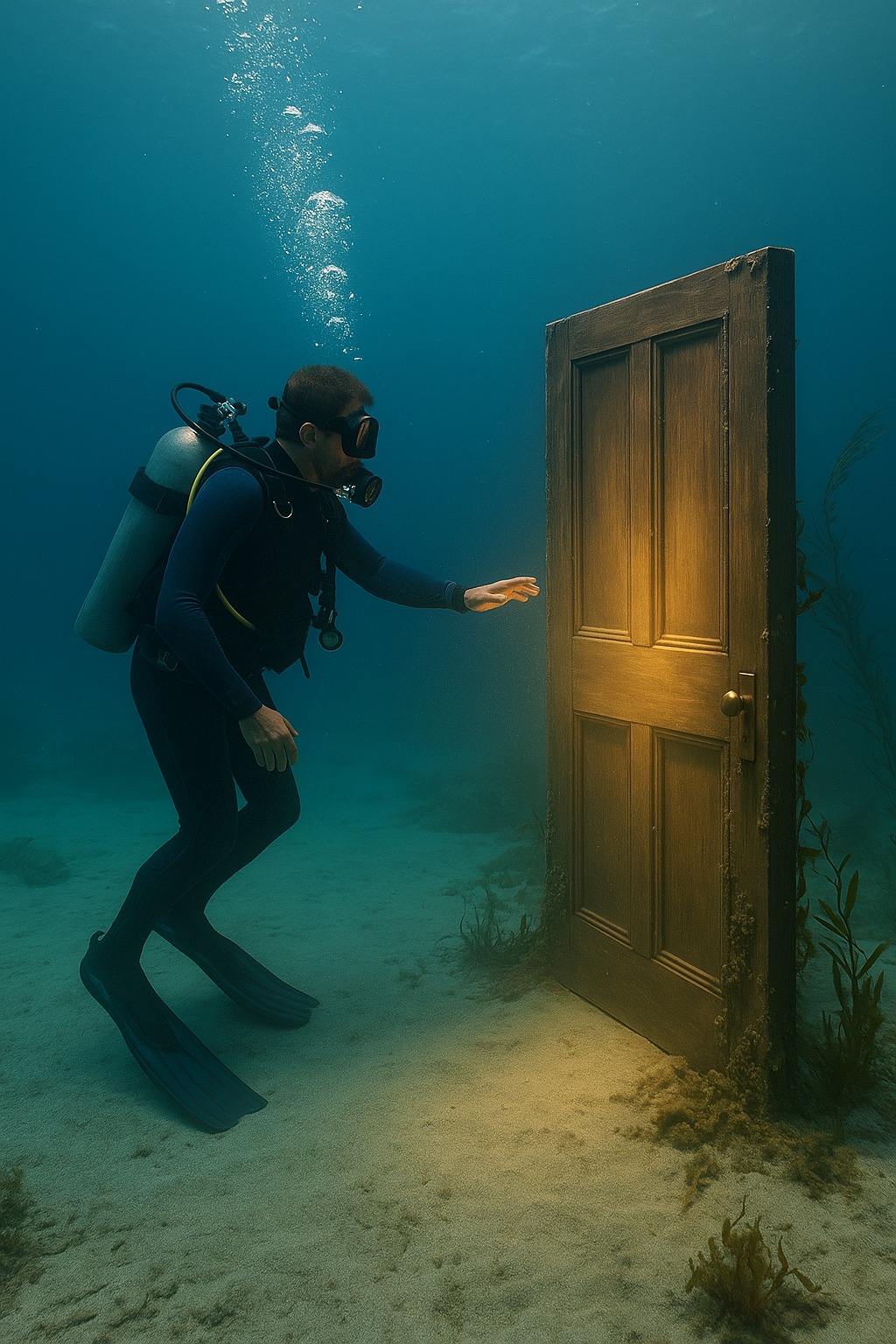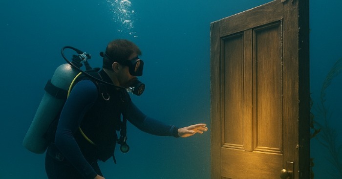 Drevené dvere, stojace vo vzpriamenej polohe v piesku, ošúchané, ale nepoškodené. Na ich povrchu sa držali barnacles a okolo rámu sa lenivo vinuli morské riasy. Ale boli voľne stojace – neboli pripevnené k žiadnym stenám ani konštrukciám. Len dvere, stojace tam, kde by žiadne dvere nemali byť.