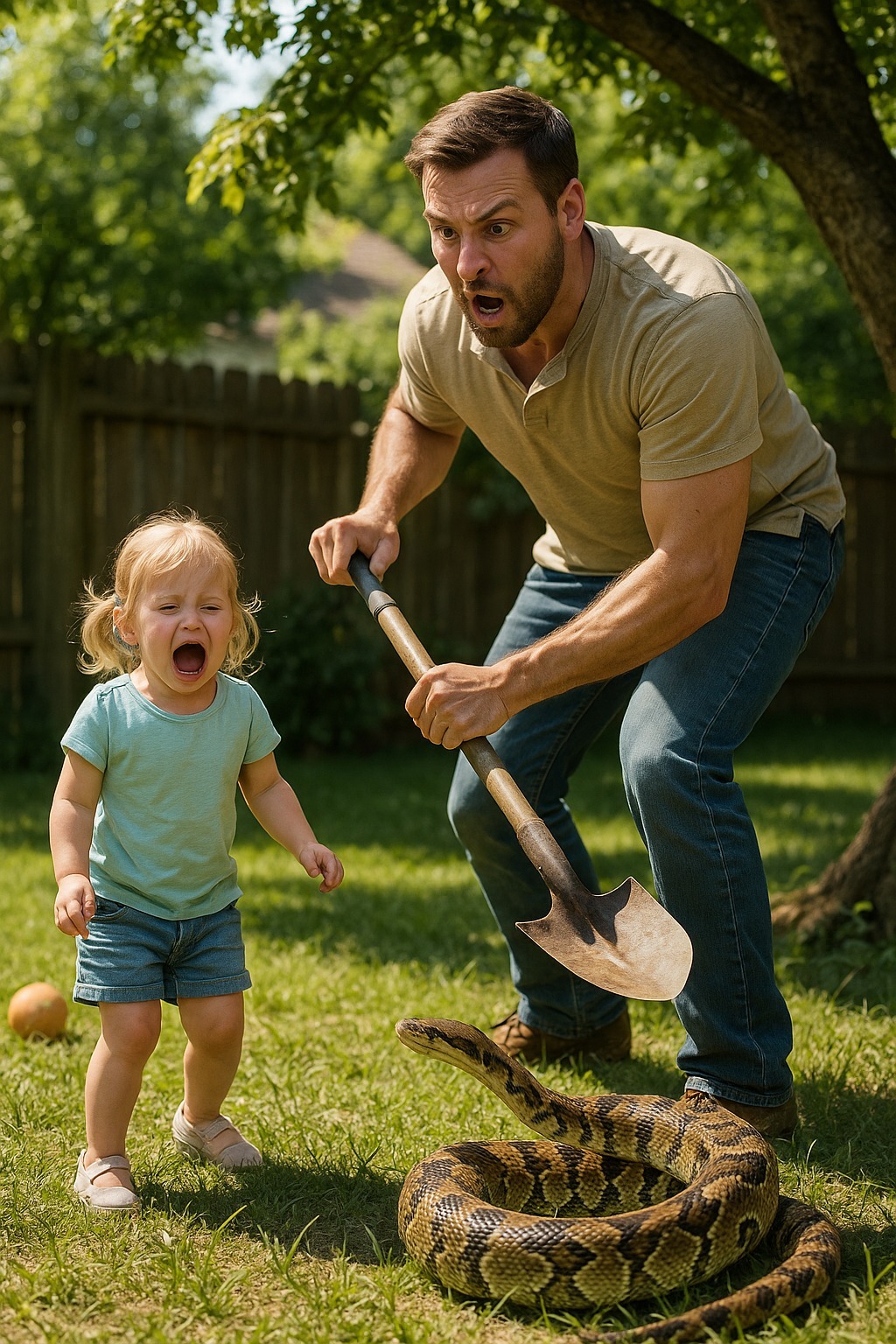 Zrazu som počul šušťanie nad hlavou. Vetvy stromu pri plote sa pohli a niečo sa z nich odtrhlo. Obrovský had spadol s ťažkým buchnutím priamo vedľa mojej dcéry.