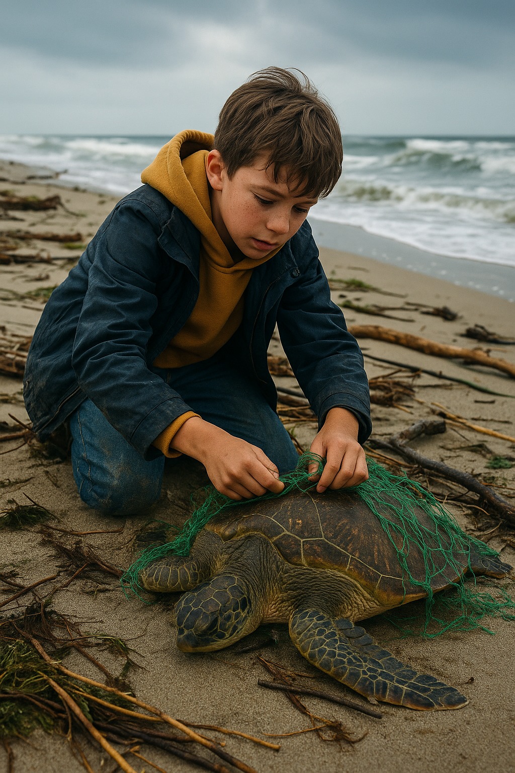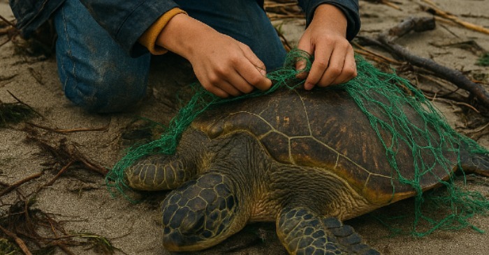 na piesku ležala veľká morská korytnačka, zamotaná v zvyškoch rybárskej siete.
