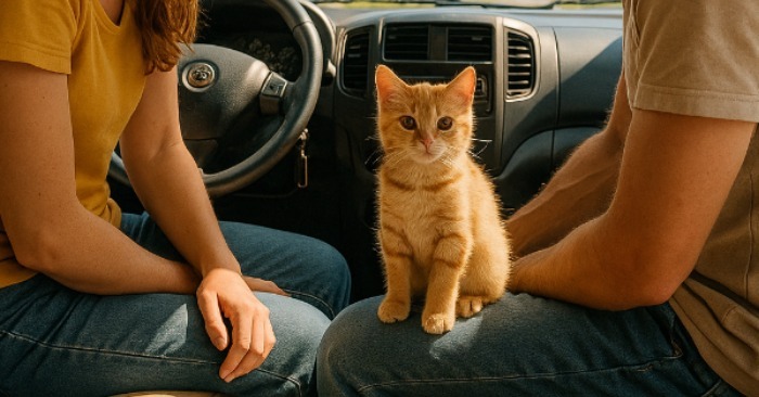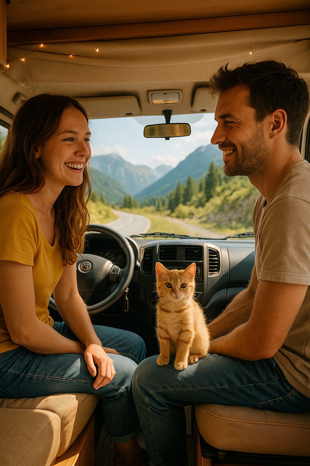 Sedeli pri dodávke — Emma, David a ryšavé mačiatko s jantárovými očami, ktoré pradlilo v tichu hôr a západu.