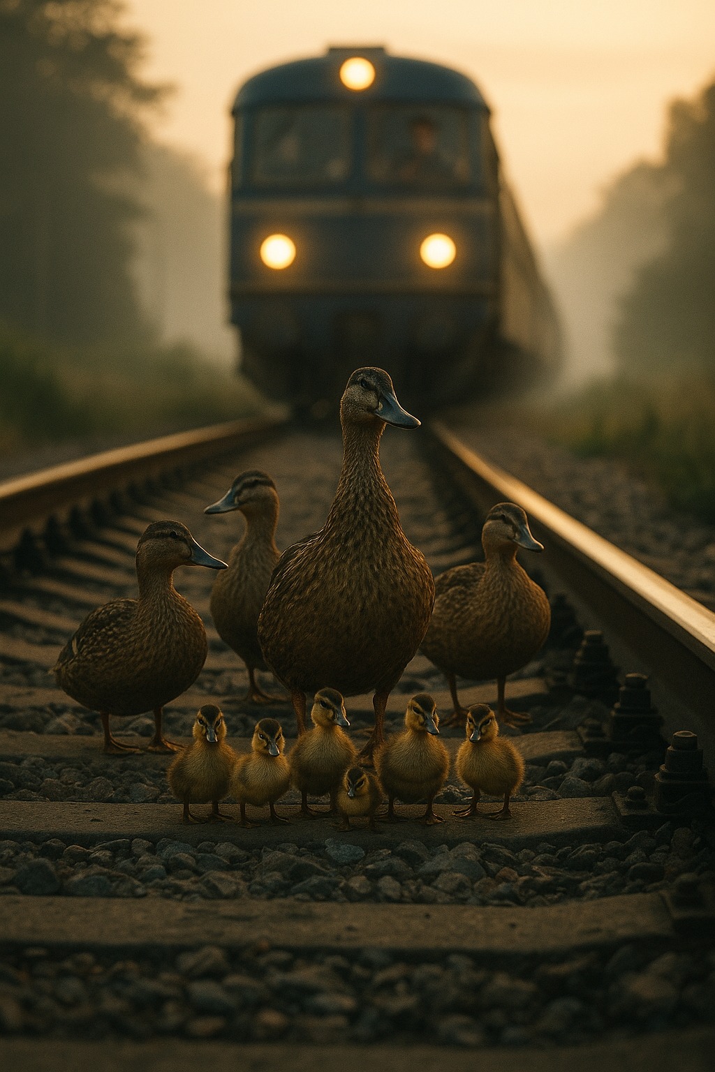 Rušňovodič s pomocníkom zišli z lokomotívy a pomaly sa priblížili. Až vtedy zistili, prečo kačice neodlietajú. Medzi podvalmi, priamo pod nimi, sedeli malé káčatká — niektoré uviazli medzi kameňmi. Dospelé kačice ich chránili, stojac nad nimi ako živý múr.