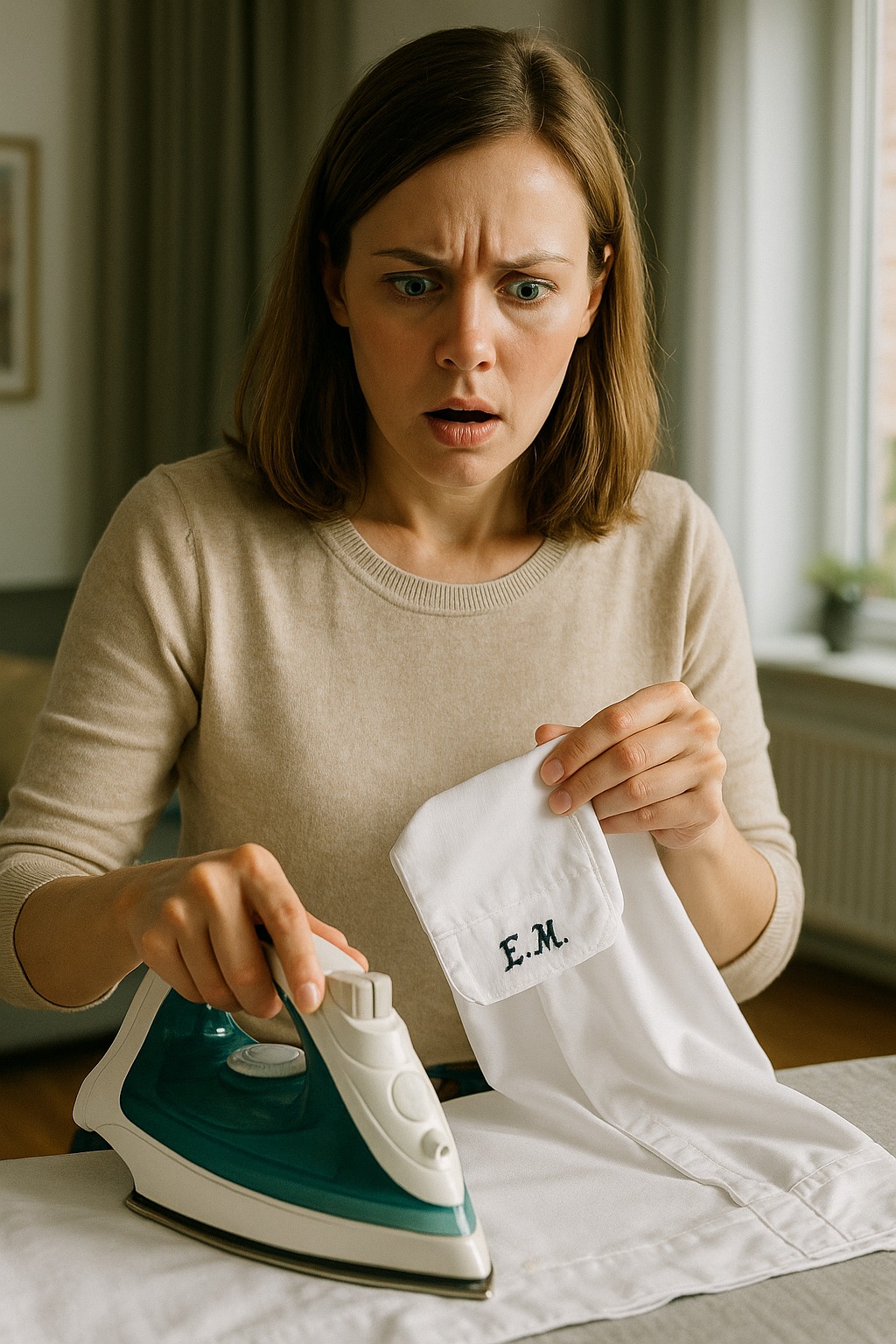 Anna položila žehličku, prešla po látke dlaňou — a vtom si všimla: na vnútornej strane manžety boli jemne vyšívané písmená. Bledomodrou niťou, sotva viditeľné, ale čitateľné: „E.M.“