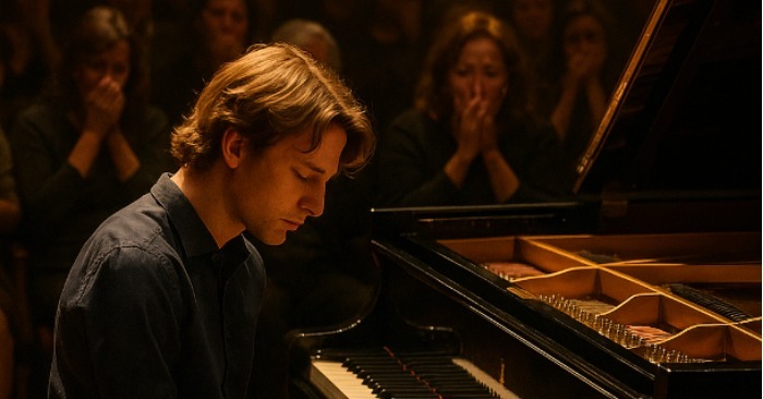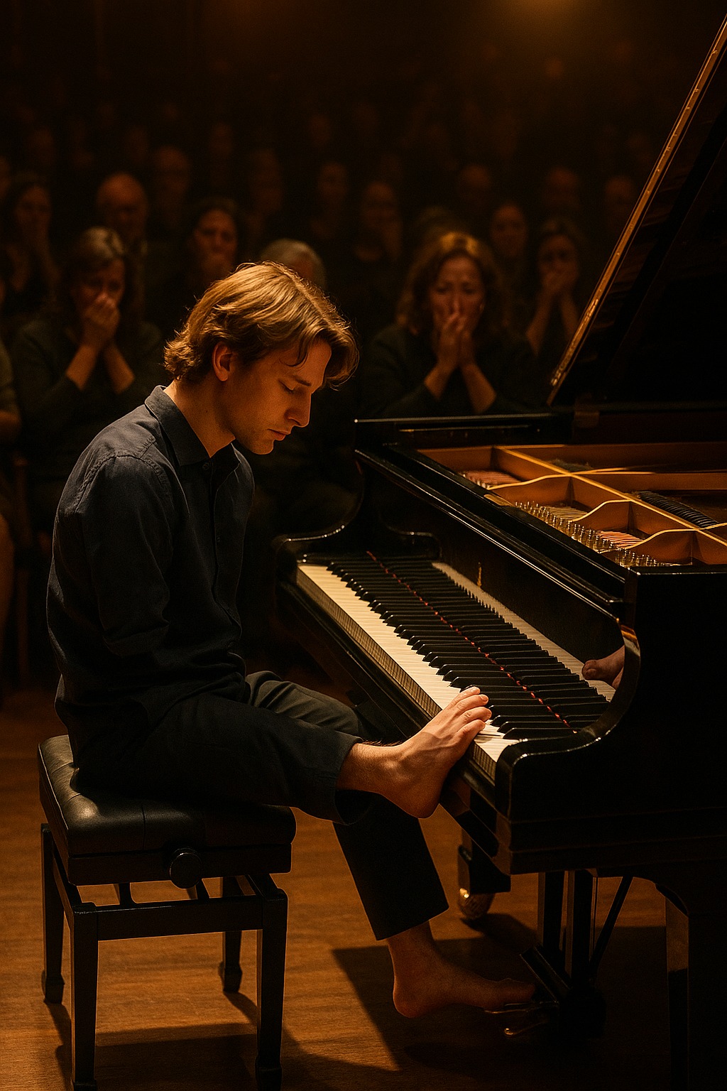 Leo vyšiel na pódium. Bez rozpakov, bez ľútosti k sebe samému. Sadol si za klavír, nadýchol sa a položil nohy na klávesy. Prvý akord znela nesmelá. Druhý – istejšie. O minútu počúvala celá sála. Nehral len melódiu – rozprával príbeh: o bolesti, viere, láske a slobode.