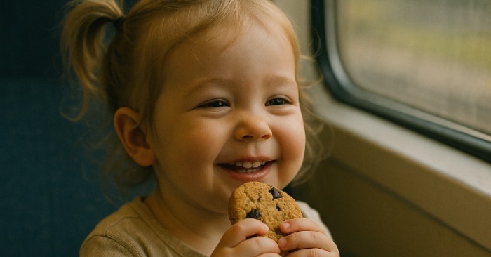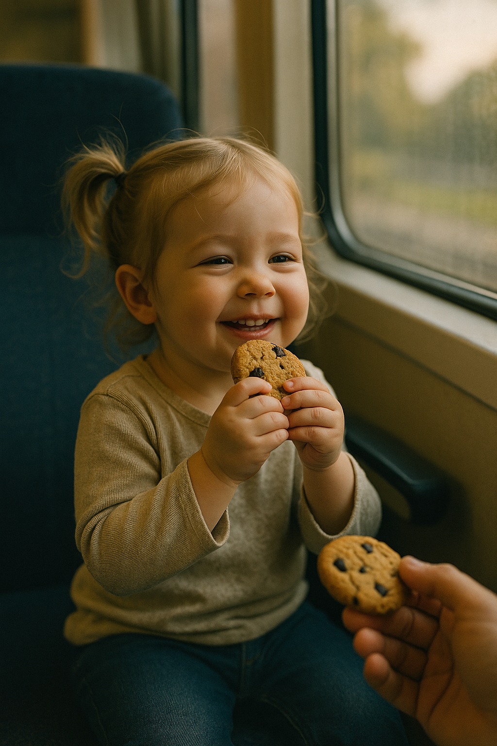 Vybral som balíček sušienok a šálku kávy z termosky — jednoduchá radosť z cesty. Na chvíľu som sa otočil, a keď som sa pozrel späť, dievčatko už žulo jednu z mojich sušienok. Pozeralo mi priamo do očí a chrumkalo, akoby skúšalo moju reakciu.