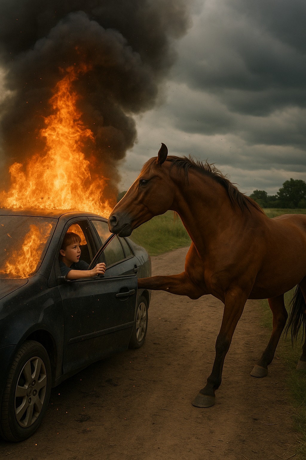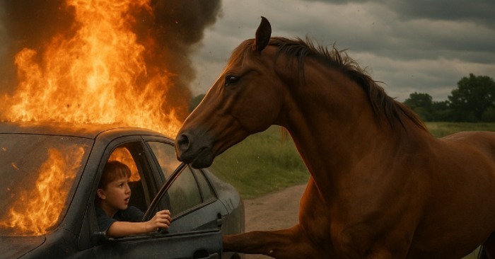 Na prázdnej ceste sa Ethan na sekundu pozrel na telefón. Auto zišlo z cesty, prerazilo kríky a narazilo do stromu. Z motora sa začal valiť dym. Ethan omdlel. Liam, pripútaný vzadu, kričal, snažil sa otvoriť dvere — márne. Všade sa šíril dym a plamene. Okolo nikto. Len ticho, pole… a kôň.