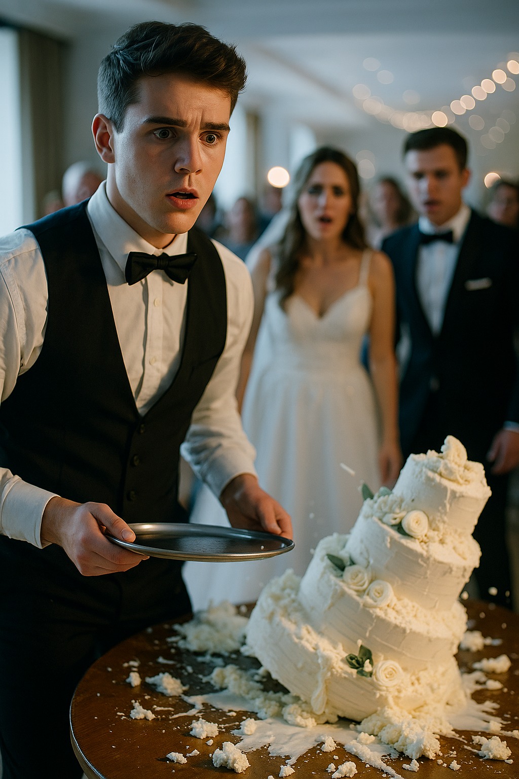Rozhovory v sále utíchli, hostia zdvihli telefóny. Obrovská, viacposchodová torta sa pomaly posúvala na vozíku. Bielučká, ozdobená krémovými ružami a zlatými stuhami — skutočné majstrovské dielo. Niesol ju mladý čašník Ilja — snaživý, slušný, no trochu nervózny. Bola to jeho prvá veľká svadba.