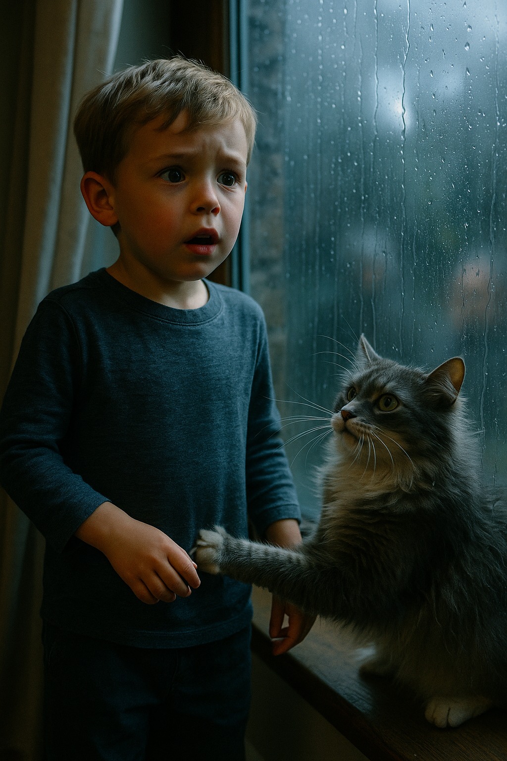 Dážď neprestával už tretí deň. Nebo viselo nízko, akoby sa nakláňalo nad starým domom, kde žil Oliver, päťročný chlapec s bystrými očami, a jeho mama Sofia. Hromy duneli v diaľke, ale Oliver sa nebál — naopak, páčilo sa mu pozorovať, ako po skle stekajú kvapky a spájajú sa do celých „riek“.