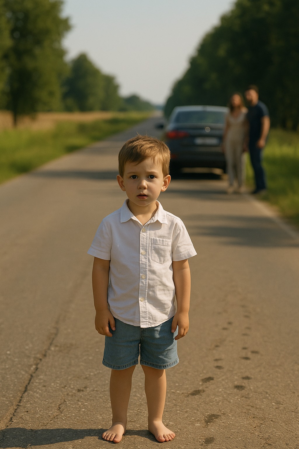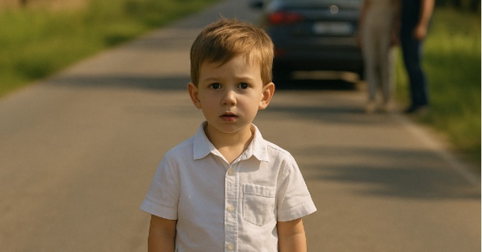 Na asfalte, priamo pod páliacim slnkom, stál malý chlapec — bosý, v svetlej košeli a krátkych nohaviciach. Neplakal, ani sa nehýbal, len sa pozeral smerom na autá.