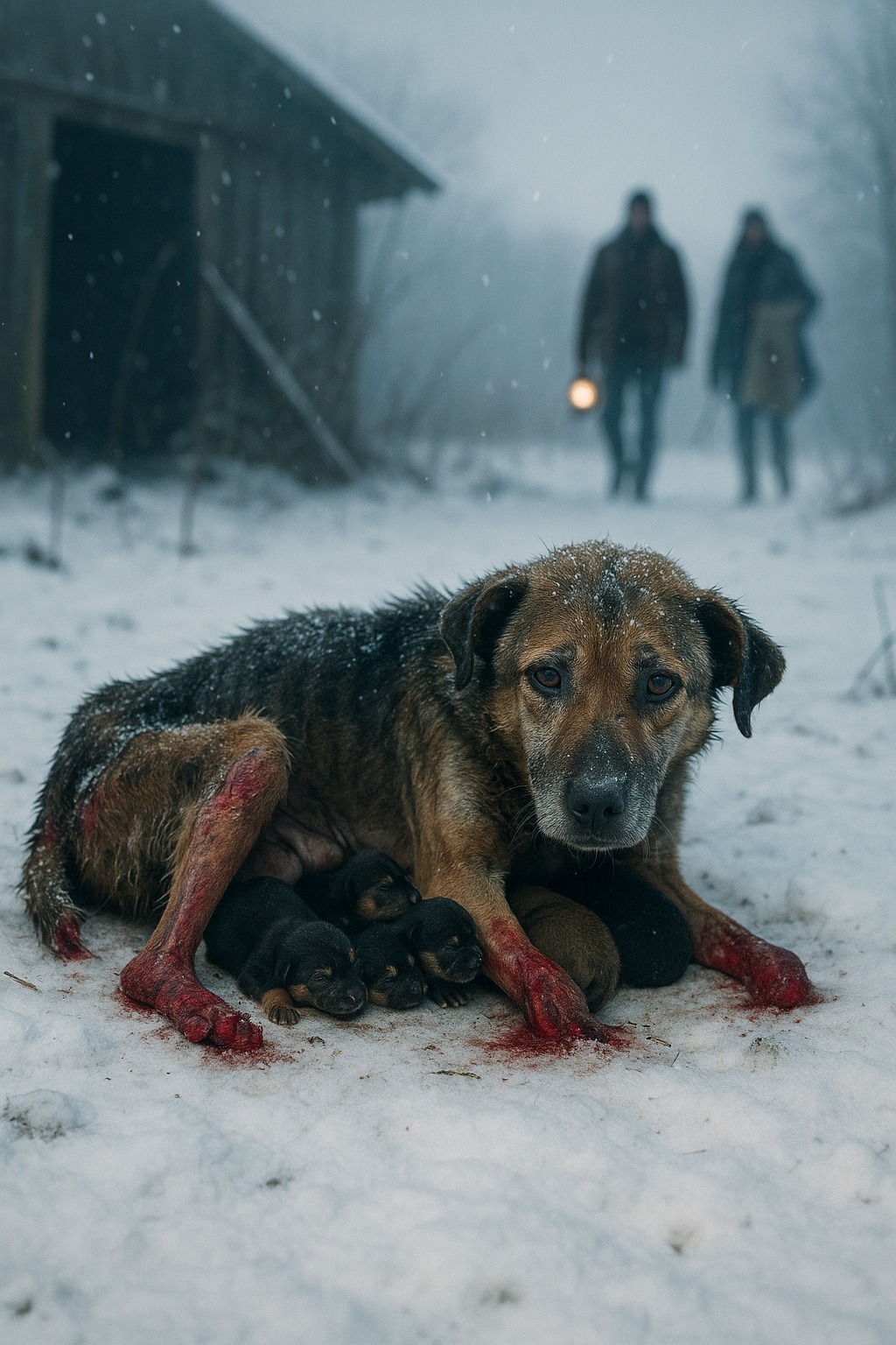 Pes zdvihol hlavu. V jej pohľade nebola ani zloba, ani prosba – len jedna prosba: „Nehýbte sa ich.“ Ticho zavrčala, ale nie zo strachu – zúfalou túžbou chrániť mláďatá až do konca.