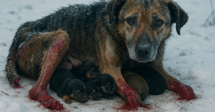 Pes zdvihol hlavu. V jej pohľade nebola ani zloba, ani prosba – len jedna prosba: „Nehýbte sa ich.“ Ticho zavrčala, ale nie zo strachu – zúfalou túžbou chrániť mláďatá až do konca.
