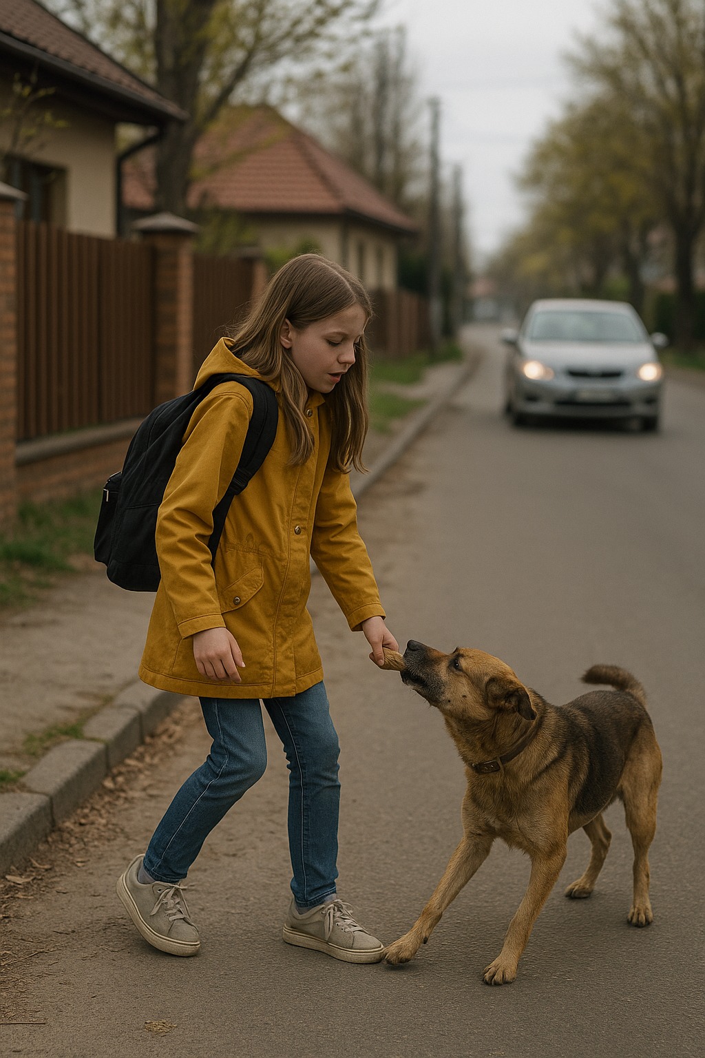 Pes pustil bundu a zavrčal, akoby kontroloval, či nechodí ešte niekto. Sofia stála v slzách, neschopná vydať zo seba ani slovo. Keď pribehla matka, pes už sedel vedľa nej a ostražito hľadel na cestu.