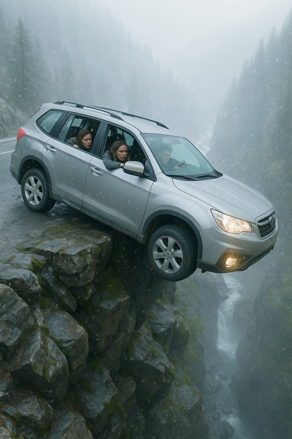 Stáli sme na úzkom páse zeme nad priepasťou. Dole bol tmavý les a útes. Auto zázrakom držali dva obrovské kamene. Sneh padal čoraz silnejšie, cesta už bola takmer neviditeľná. Telefón – spojenie nefungovalo.