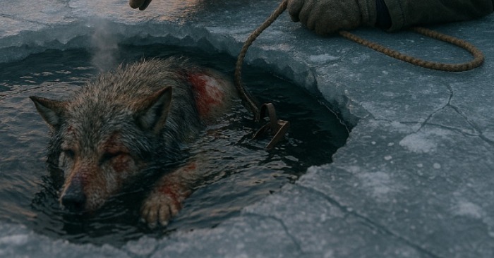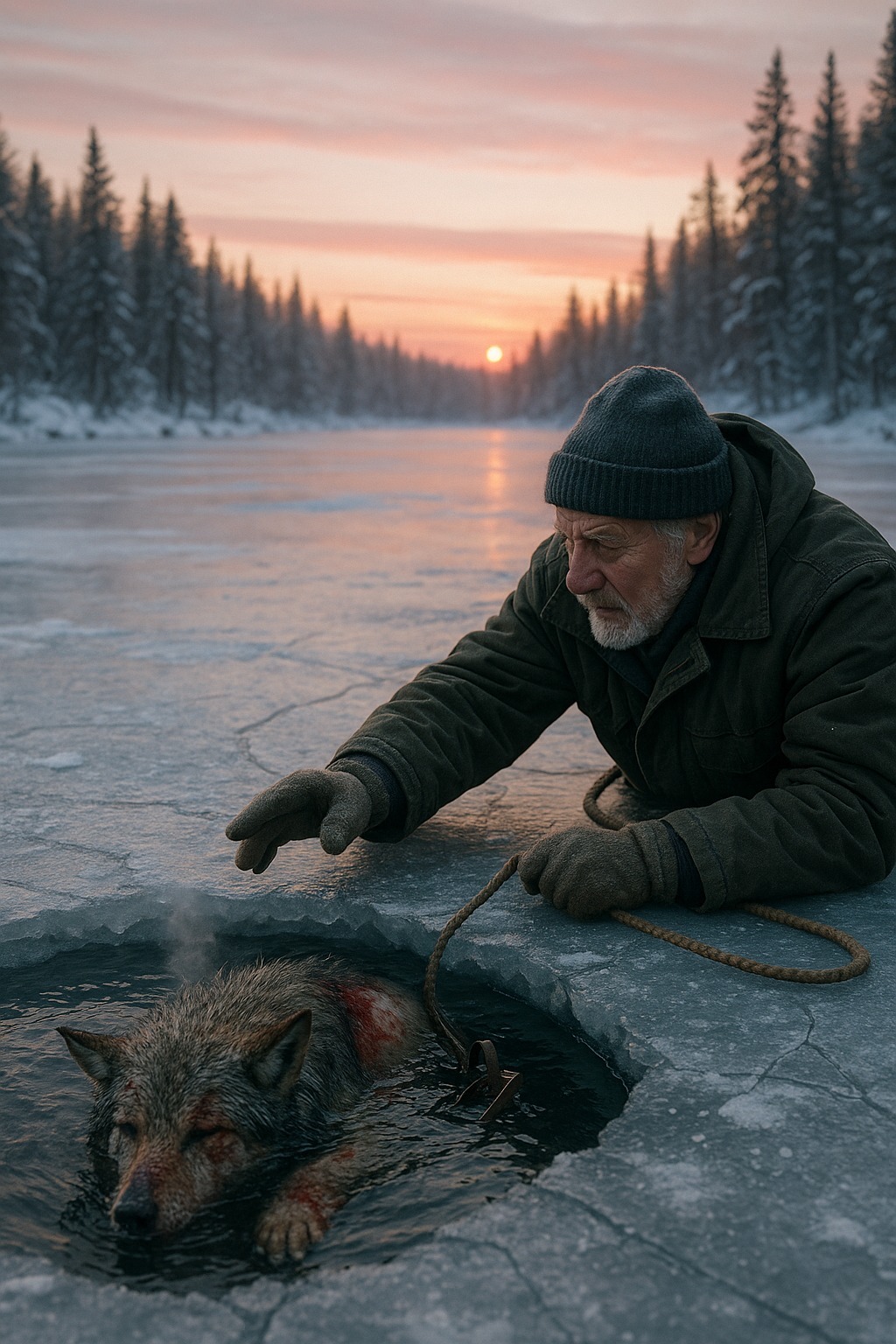 Pripevnil lano k opasku a druhý koniec k borovici. Ľad praskal pri každom kroku. Vlk zdvihol hlavu, ale ani sa nepokúsil zavrčať – nemal na to silu. Michail si ľahol na brucho, prikradol sa, hodil lano na labky vlka a pomaly ho potiahol.