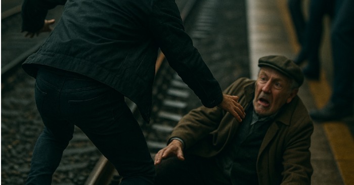 Rozbehol sa k starcovi, ktorý tam ležal a nemohol sa vstať, chytil ho za plecia a pokúsil sa ho zdvihnúť. Koľaje boli klzké, hluk ohlušujúci, vietor z blížiaceho sa vlaku mu už fúkal do tváre.