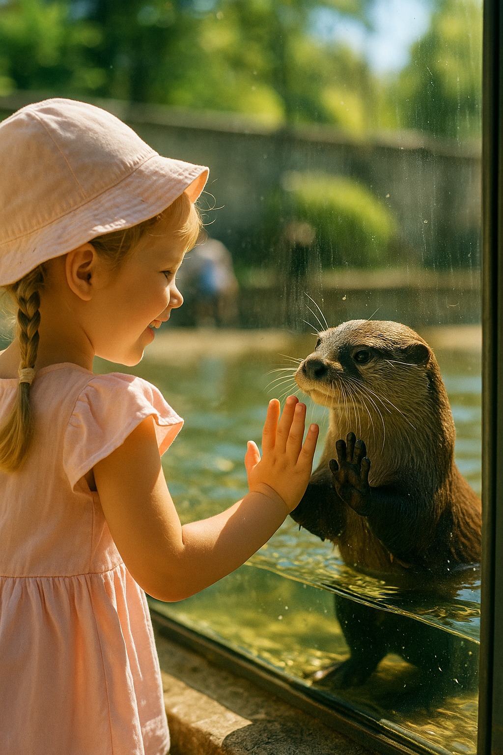 V blízkosti vodného výbehu, obklopeného sklom, sa naozaj čľapkali dve vydry – rýchle a obratné, ako malé tiene v slnečnom žiarení. Jedna z nich zrazu priplávala priamo k sklu a pozrela sa dievčaťu priamo do očí. Dievča sa zasmialo a pritlačilo dlaň na sklo. Vydra tiež položila labku oproti.