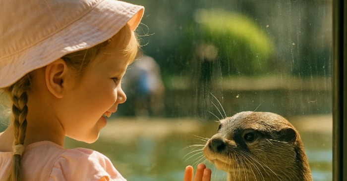V blízkosti vodného výbehu, obklopeného sklom, sa naozaj čľapkali dve vydry – rýchle a obratné, ako malé tiene v slnečnom žiarení. Jedna z nich zrazu priplávala priamo k sklu a pozrela sa dievčaťu priamo do očí. Dievča sa zasmialo a pritlačilo dlaň na sklo. Vydra tiež položila labku oproti.