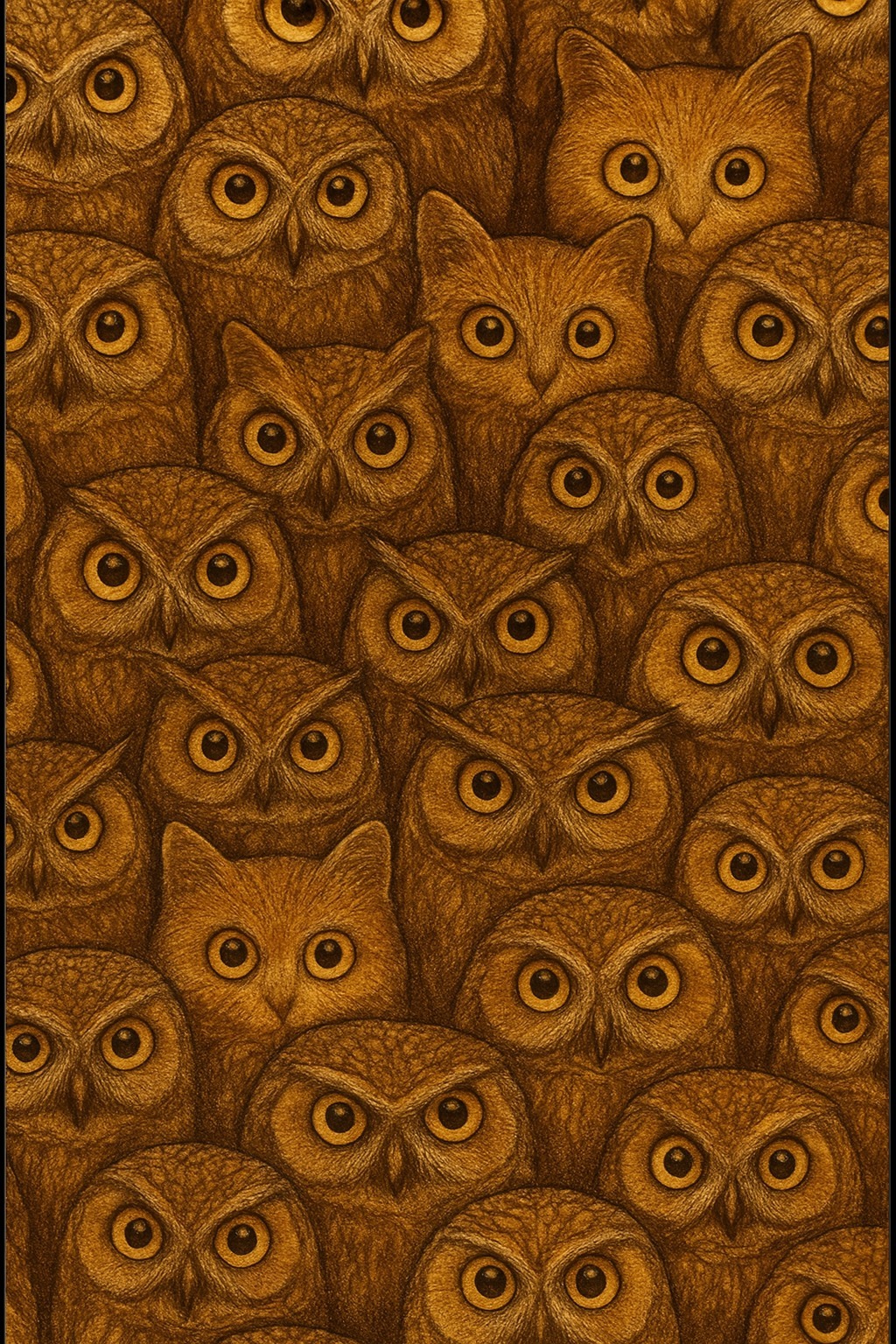 Na prvý pohľad sa obrázok javí ako obyčajné husté kŕdeľ sov s obrovskými okrúhlymi očami. Všetky sú takmer identické, splývajú do jedného vzoru a hľadia priamo do vašej duše. Umelec však nastražil pascu: medzi desiatkami sov sú skryté tri mačky, majstrovsky maskované ako ich operené susedky.