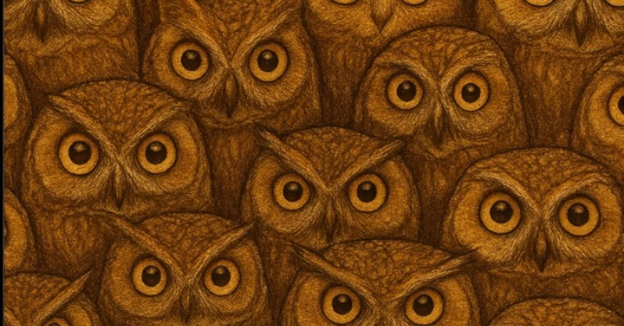 Na prvý pohľad sa obrázok javí ako obyčajné husté kŕdeľ sov s obrovskými okrúhlymi očami. Všetky sú takmer identické, splývajú do jedného vzoru a hľadia priamo do vašej duše. Umelec však nastražil pascu: medzi desiatkami sov sú skryté tri mačky, majstrovsky maskované ako ich operené susedky.