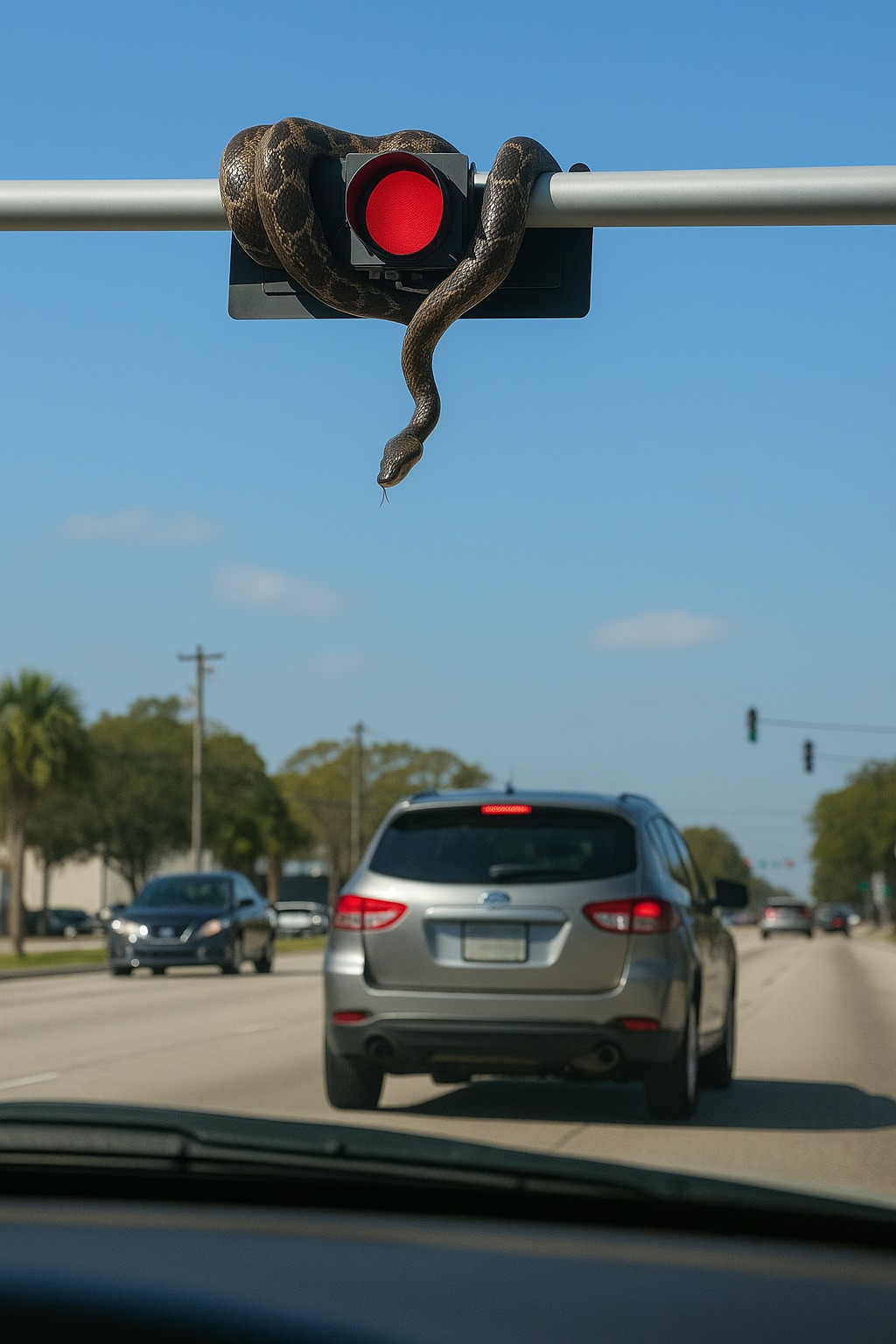 Dlhý, tmavoolivový, s hranatou, mierne sploštenou trojuholníkovou lebkou. Plazil sa priamo k pruhu, kde parkovali autá.