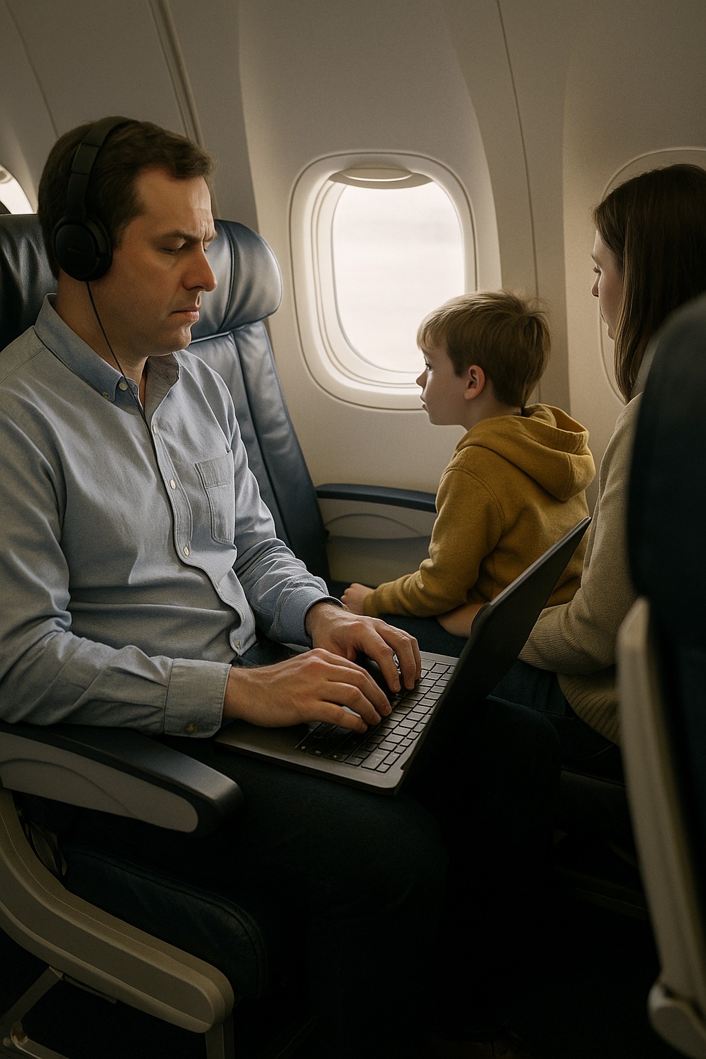 Keď lietadlo naberalo výšku a oblaky tvorili pod krídlom biely koberec, muž sa pozrel z okna. Na sekundu zavrel oči kvôli slnku – a v odraze uvidel toho istého chlapca. Sedel oproti uličke a naťahoval krk, aby zazrel na oblohu.