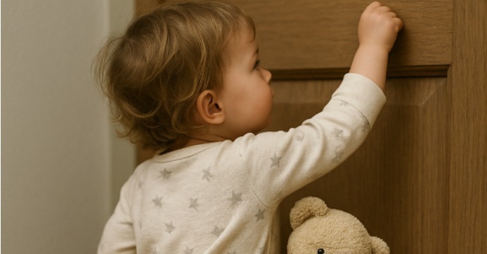 Malý chlapček stál na špičkách a päsťou klopal na dvere, v druhej ruke držal plyšového medvedíka. Mal na sebe pyžamo s hviezdičkami, vlasy mal rozstrapatené a oči ospalé.