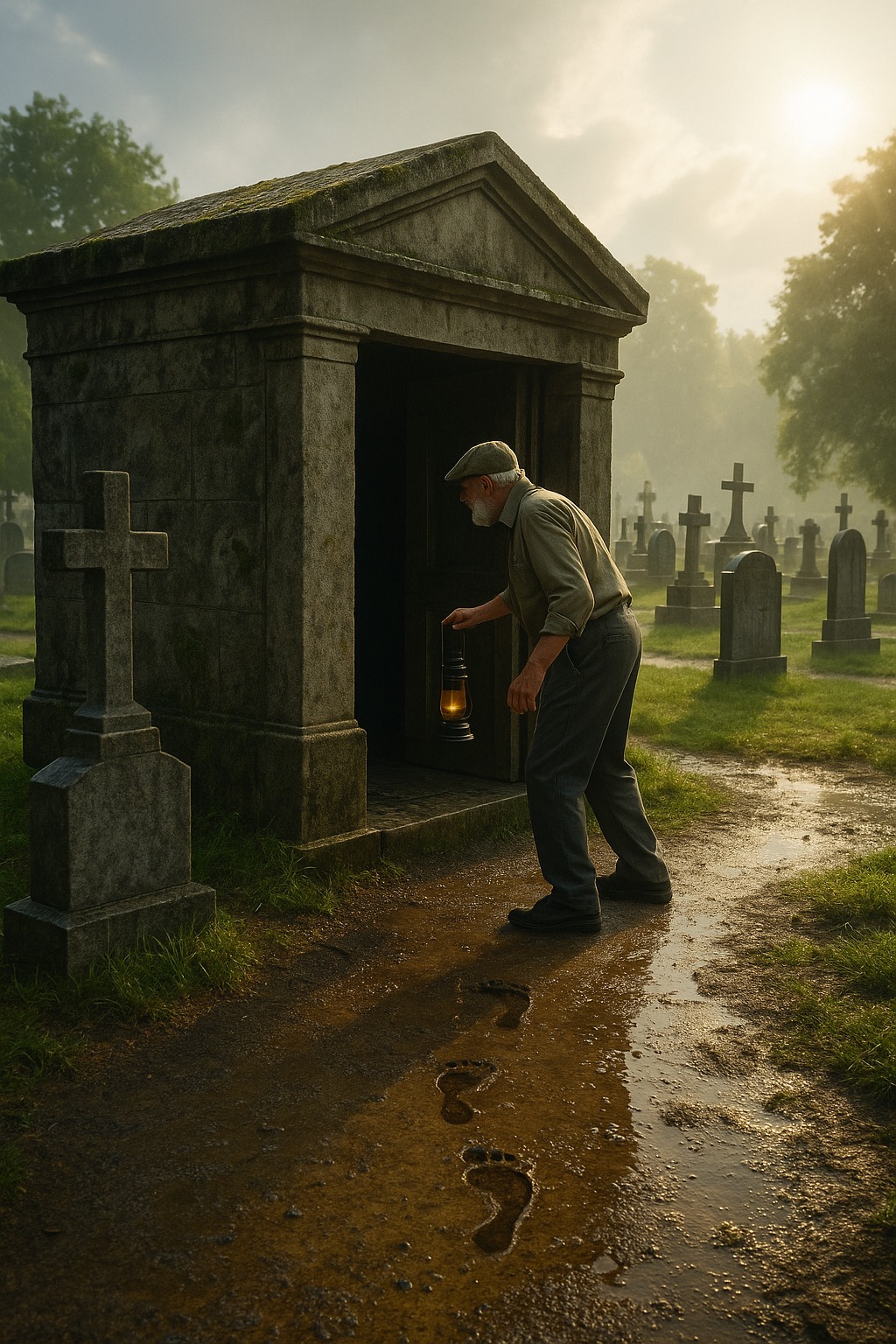 Keď sa priblížil, uvedomil si: masívne dvere krypty boli pootvorené. Kameň, ktorý ich držal stáročia, bol rozbitý bleskom. Zvnútra sa šíril chlad a zatuchnutý zápach. Franz sa naklonil, chcel nazrieť dovnútra, ale všimol si na zemi bosé stopy. Veľmi čerstvé. Viedli od dverí a mizli medzi hrobmi.