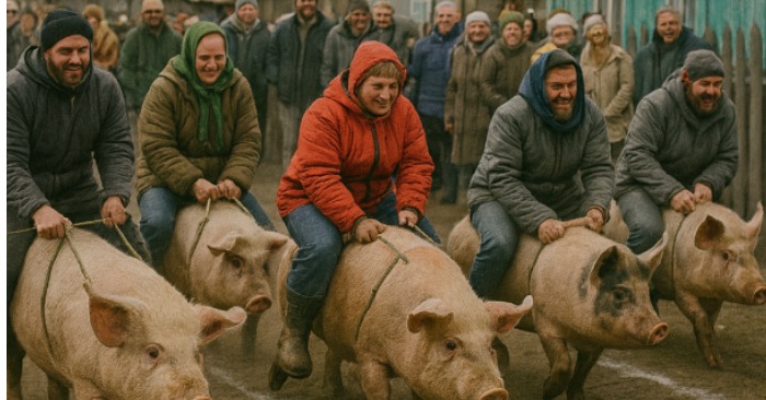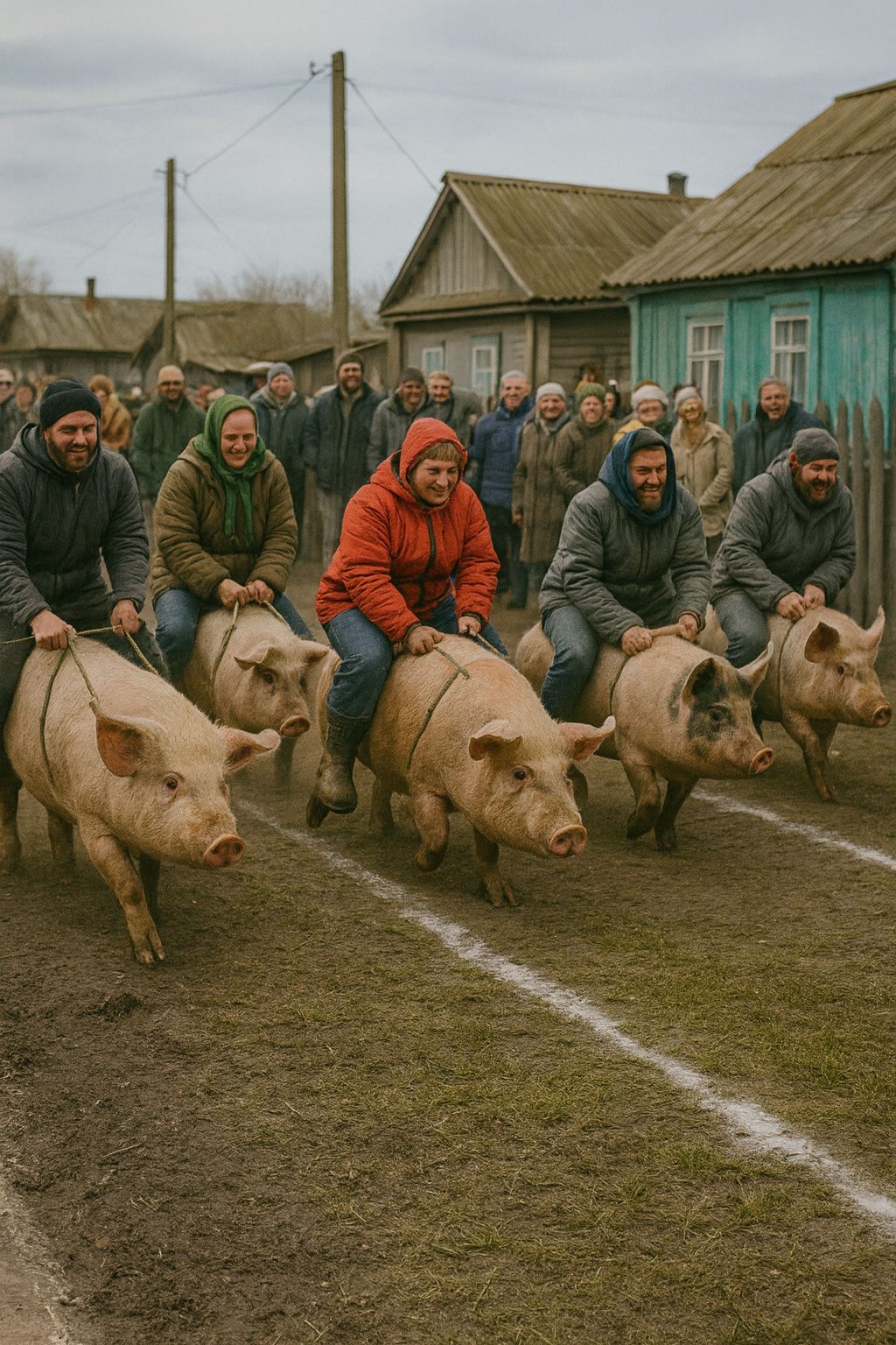 Najprv sa smiali. Ale čím viac sa smiali, tým viac sa nápad uchytil. Do hodiny celá dedina vedela: dnes večer sa budú konať prasacie preteky. A to sa začalo. Prípravy boli horšie ako na zraz. Niekto priniesol žiarivé stužky, aby odlíšil „športovcov“. Niekto začal vyrábať provizórne sedlá zo starých vriec, hoci žiadne prasa neplánovalo nič nosiť. Deti kriedou nakreslili štartovaciu čiaru a dospelí sa hádali, čie prasa je „najviac aerodynamické“. Prasatá, úplne si neuvedomujúce rozsah podujatia, sa s radosťou hrabali v blate.
