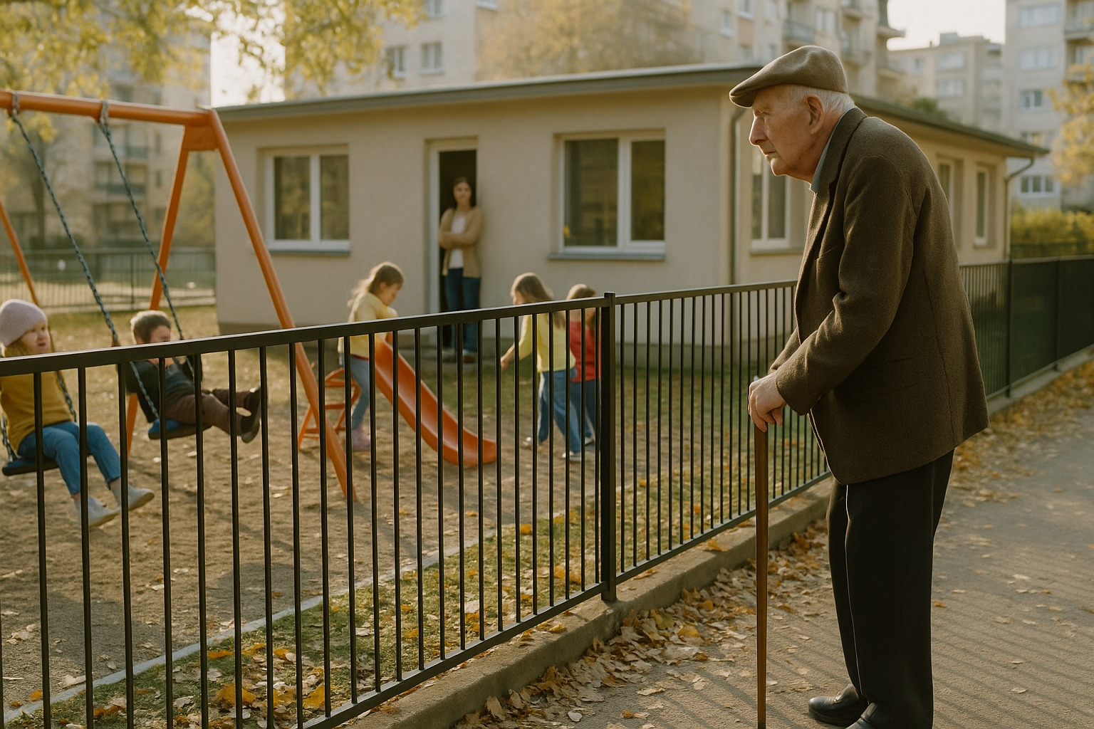 Ema si najprv myslela, že je to len osamelý sused. Stál pár metrov od brány, ruky zložené na rúčke opotrebovanej palice, sivá bunda príliš tenká na vietor. Zatiaľ čo rodičia vbehli a vybehli, on len sledoval ihrisko a často žmurkal, akoby ho neskoré popoludňajšie slnko bolelo v očiach.