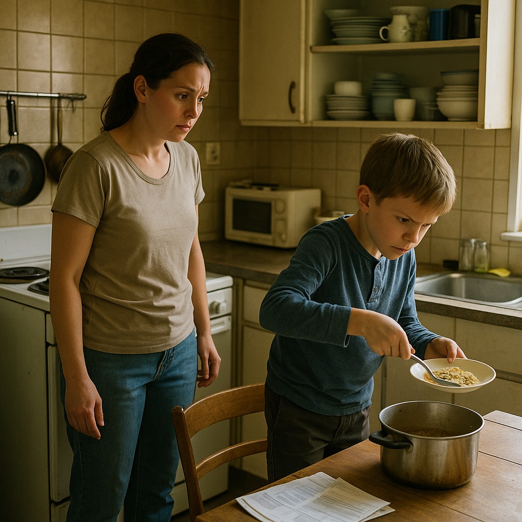Ale jeden utorkový večer, keď prišla z práce skôr ako zvyčajne, uvidela Noaha stáť na stoličke a opatrne naberať jedlo z hrnca do malého plastového taniera. Jeho ramená boli napäté, pohyby rýchle, previnilo.