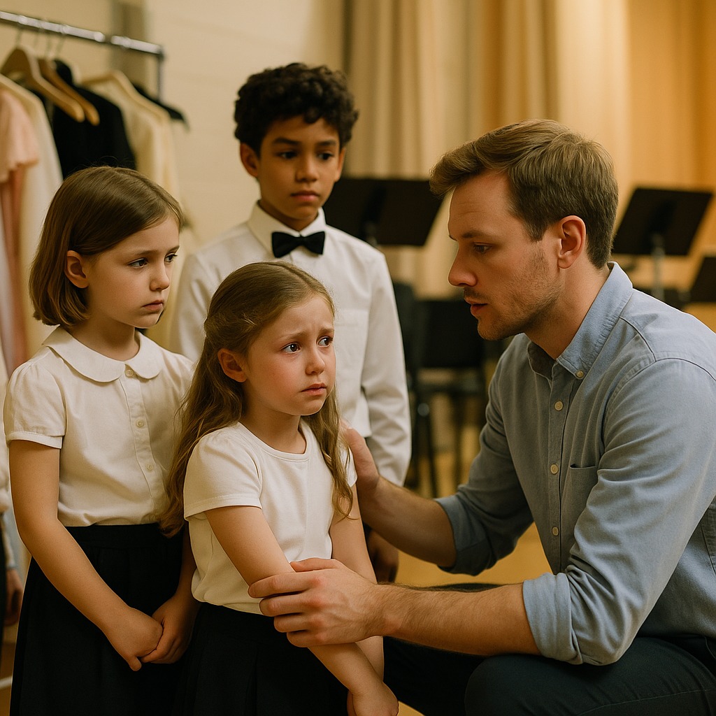 Opona sa otvorila. Deti stáli v nerovných radoch, vyzerali malé a zrazu veľmi vážne. Mia zdvihla ruky a prvé tóny sa vznášali do vzduchu.
