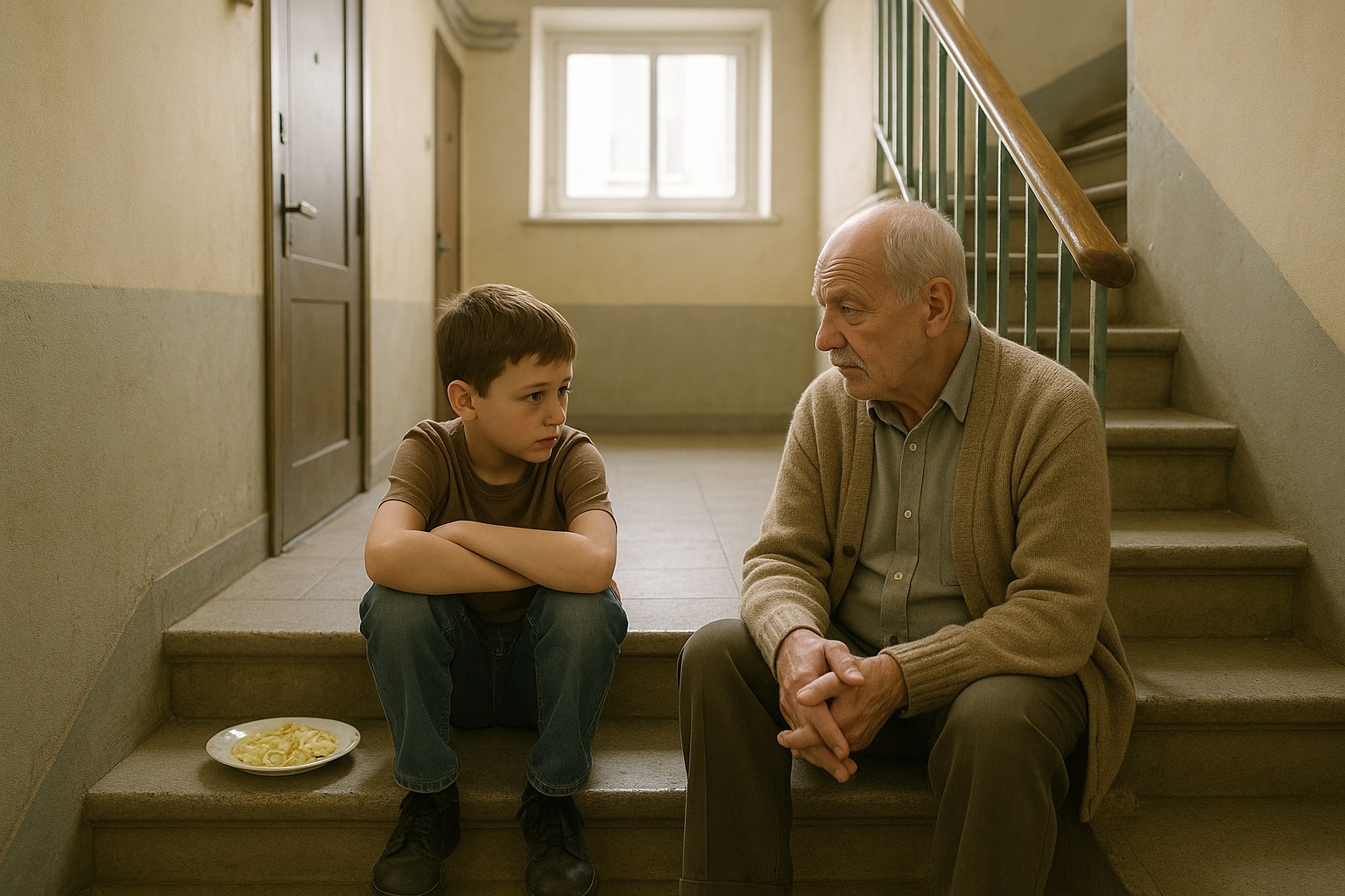 Keď sa platba neukázala, Martin vytlačil zdvorilý, ale pevný oznam a zasunul ho pod ich dvere. Na druhý deň neprišla žiadna reakcia. Na tretí deň začul na chodbe tiché šušťanie, pootvoril dvere a uvidel Daniela na schodisku, ako opatrne kladie odštiepený tanier na schod medzi druhým a tretím poschodím.