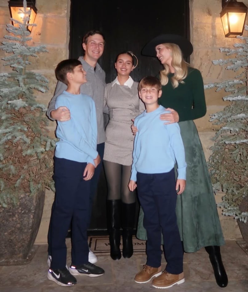 Jeden z najvýraznejších outfitov predstavoval Ivanku v smaragdovo tmavej semišovej sukni spárovanej s čiernym klobúkom a čižmami v západnom štýle – tichý odkaz na horskú eleganciu. Jej dcéra Arabella zopakovala eleganciu v šatách s pepitou stopou, zatiaľ čo Joseph a Theodore si obliekli jemné modré svetre, čím dokázali, že ani mimo práce sa rodina nevzdáva vizuálnej harmónie.