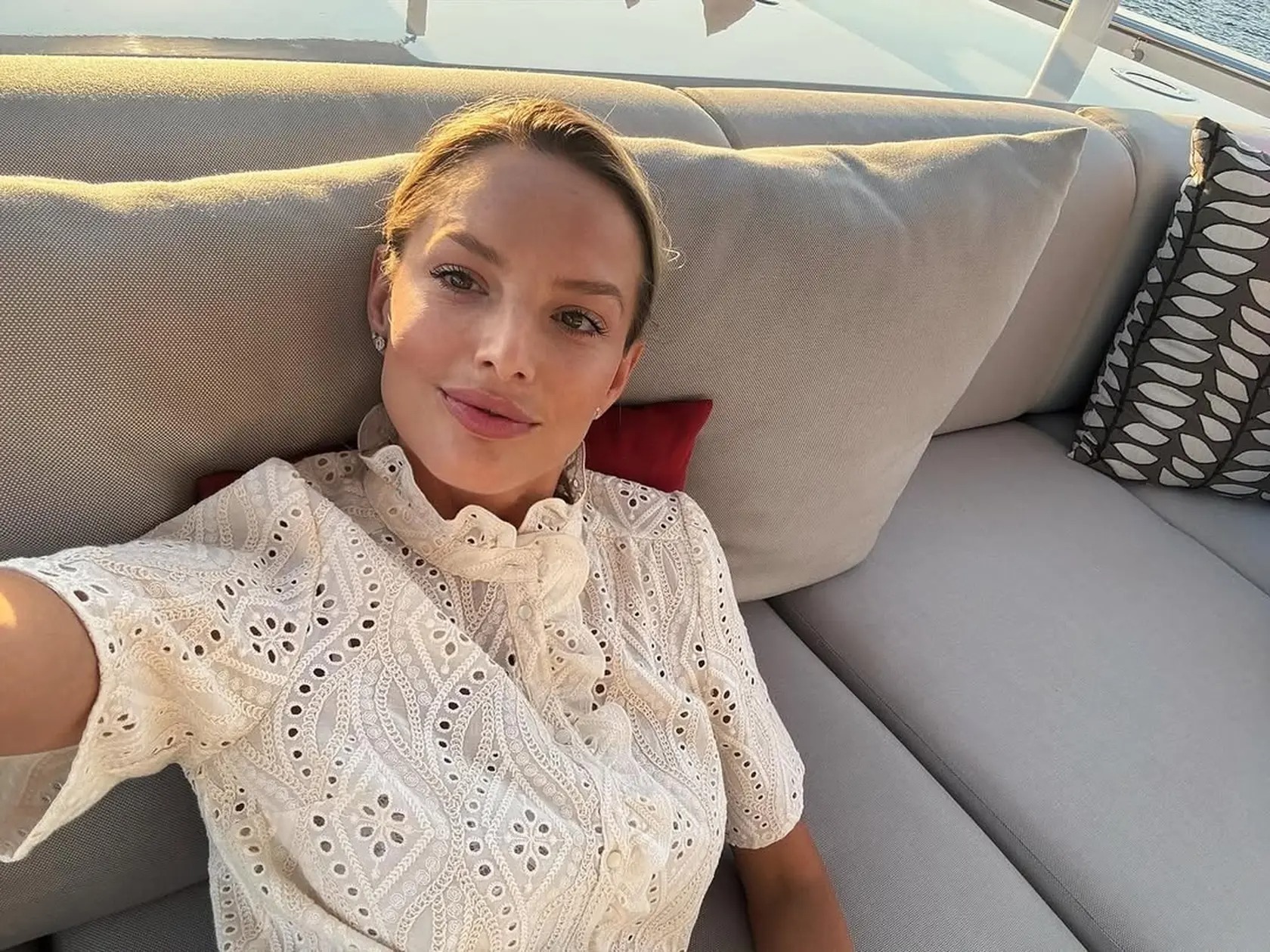 Tentoraz však fanúšikov neohúrila prehliadkovým mólom, ale dovolenkovou atmosférou ako z filmu. Na fotografiách pózuje na palube elegantnej motorovej jachty v klasickom štýle. Plavidlo má dlhý biely trup, tmavé drevené obloženie a výrazné detaily, ktoré mu dodávajú aristokratický vzhľad. Dva vysoké stožiare, čierny komín a plátenná strecha na hornej palube vytvárajú dojem noblesy a nadčasového luxusu.