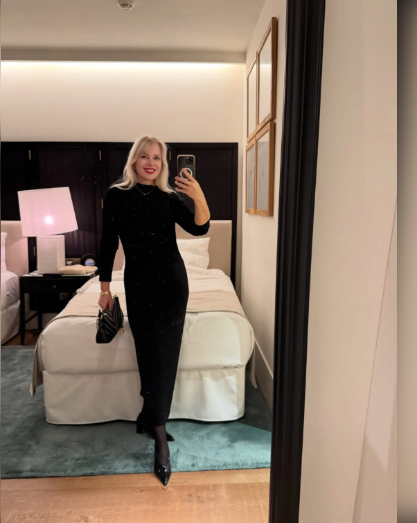 Namiesto športového outfitu či pohodlného domáceho looku siahla po čiernych obtiahnutých šatách, výraznom líčení a ikonickom červenom rúži. Výsledok? Sebavedomá, ženská a doslova žiarivá.