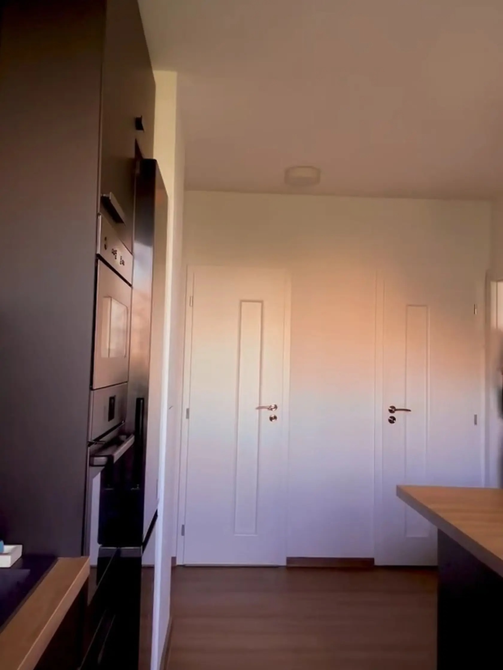 Priestor pôsobí čisto, moderne a veľmi pokojne. Kuchyňa je riešená lineárne s ostrovčekom, čo vytvára otvorený a vzdušný dojem. Minimalizmus je tu kľúčový – žiadny vizuálny chaos, všetko má svoje miesto. Teplá drevená podlaha zjemňuje moderné línie a dodáva interiéru útulnosť.
