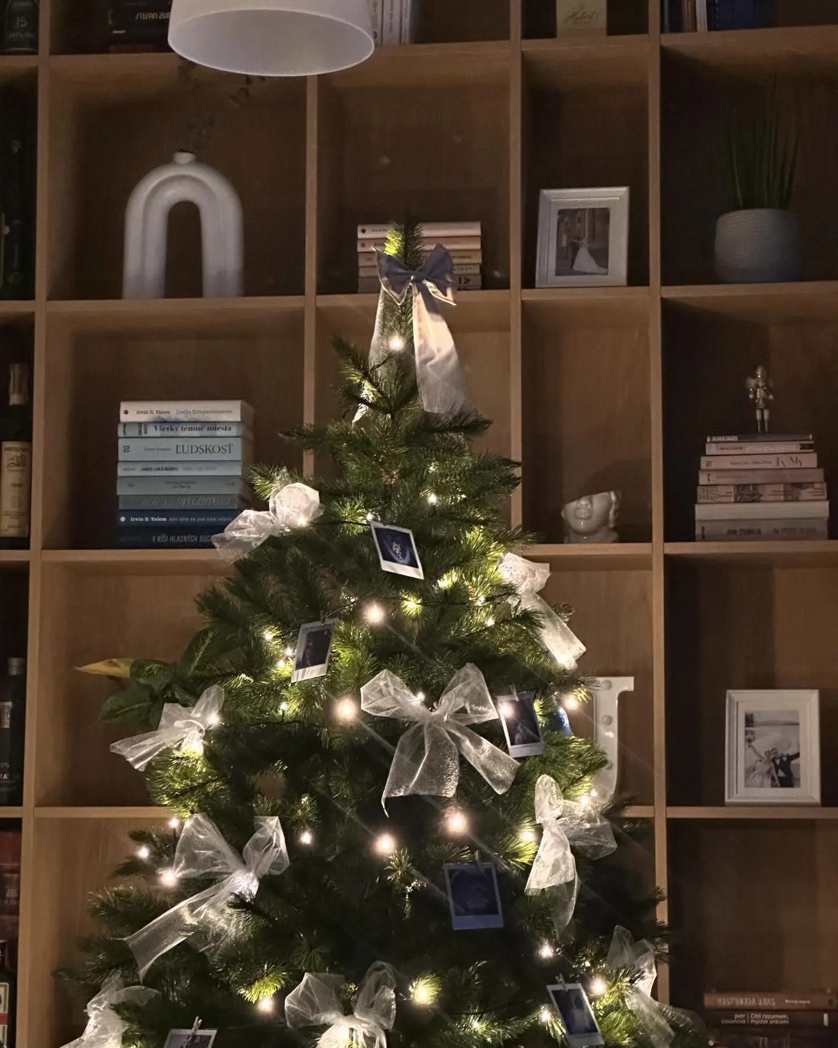 Dominantou miestnosti je vysoký vianočný stromček umiestnený pri knižnici. Ozdobený teplými bielymi svetielkami, veľkými krémovými mašľami a fotografiami zavesenými ako osobné spomienky. Nie dokonalá výkladná skriňa, ale stromček s príbehom. Svetlo je mäkké, hrejivé, bez ostrých kontrastov – presne ten typ atmosféry, ktorý človeka spomalí.