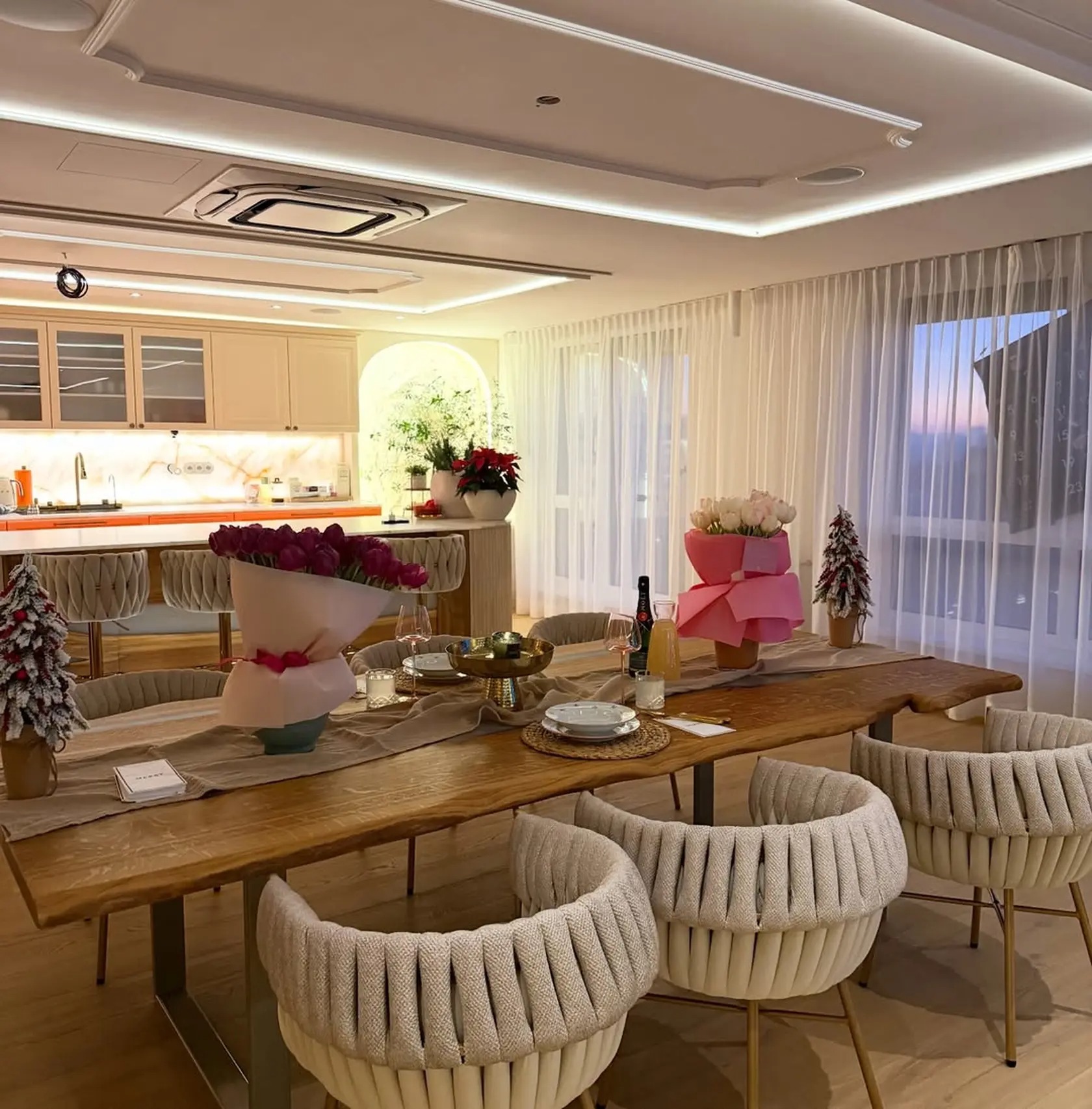 Strop je viacúrovňový s podsvietením, ktoré vytvára zóny. LED línie, bodové svetlá a nepriame osvetlenie dodávajú priestoru moderný charakter. Rastliny, kaktusy a výrazné aranžmány prinášajú do interiéru ženskosť a mäkkosť. Sklenená priečka s čiernym rámom pridáva industriálny prvok bez toho, aby brala svetlo.