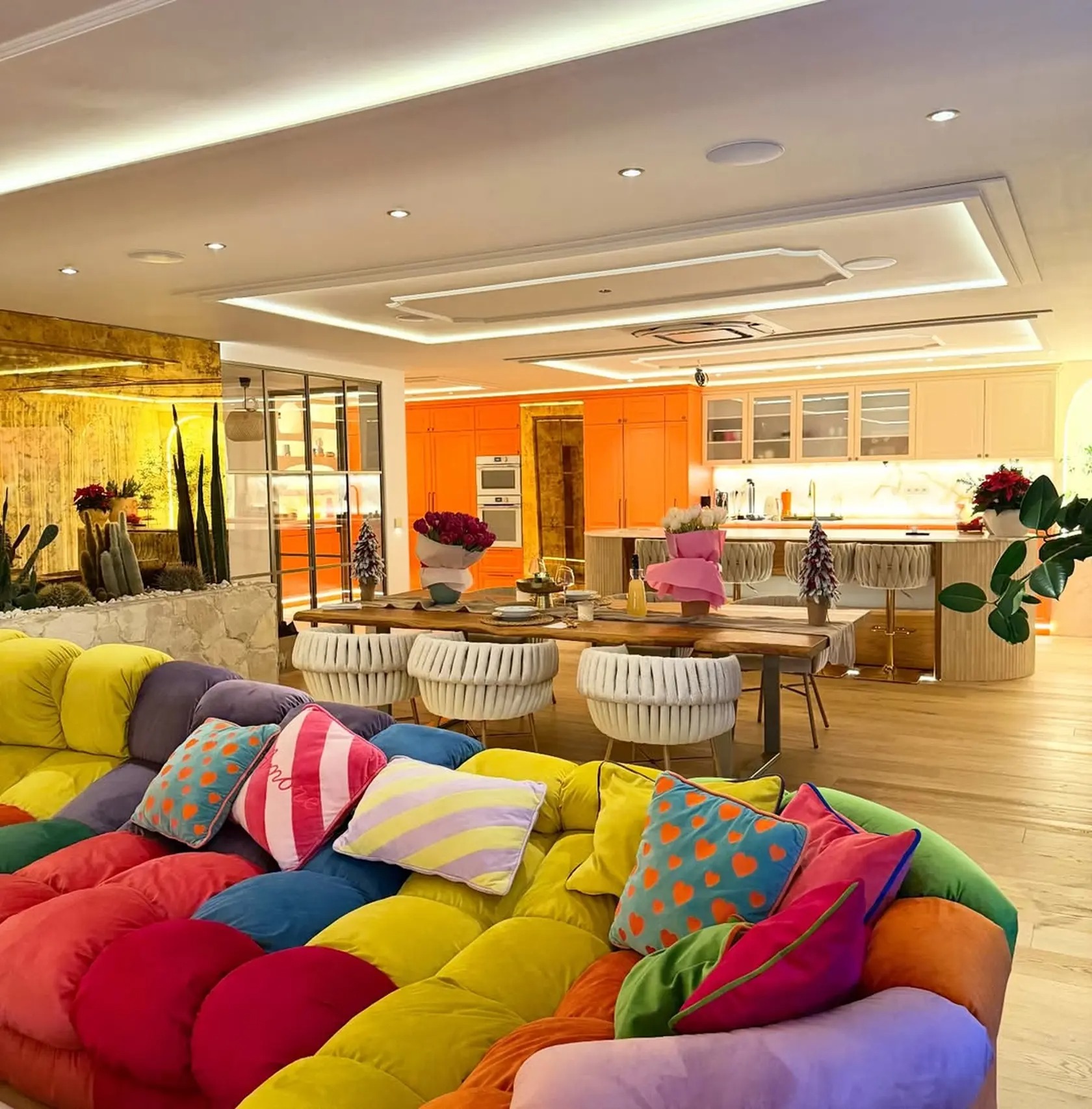 Otvorený denný priestor spája obývačku, jedáleň a kuchyňu, no každá časť má jasne definovanú identitu. Najväčší šok prichádza v obývačke. Dominantou je modulárna sedačka v štýle „Togo“, rozdelená do výrazných farebných blokov. Žltá, červená, fialová, zelená, oranžová – kombinácia, ktorú by si trúfol len málokto. K tomu hravé vankúše s pruhmi a kontrastnými detailmi.