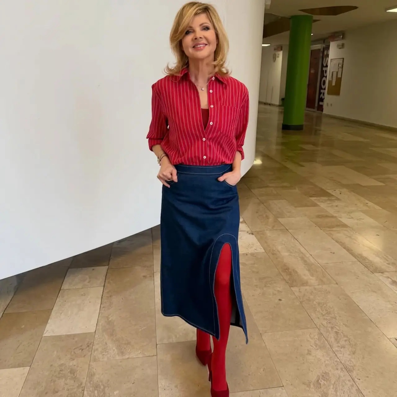 Rozparok na sukni odhaľuje nohy v sýtych červených pančuchách a celý outfit završujú červené lodičky v o niečo tmavšom odtieni, ktoré krásne ladia so zvyškom oblečenia.