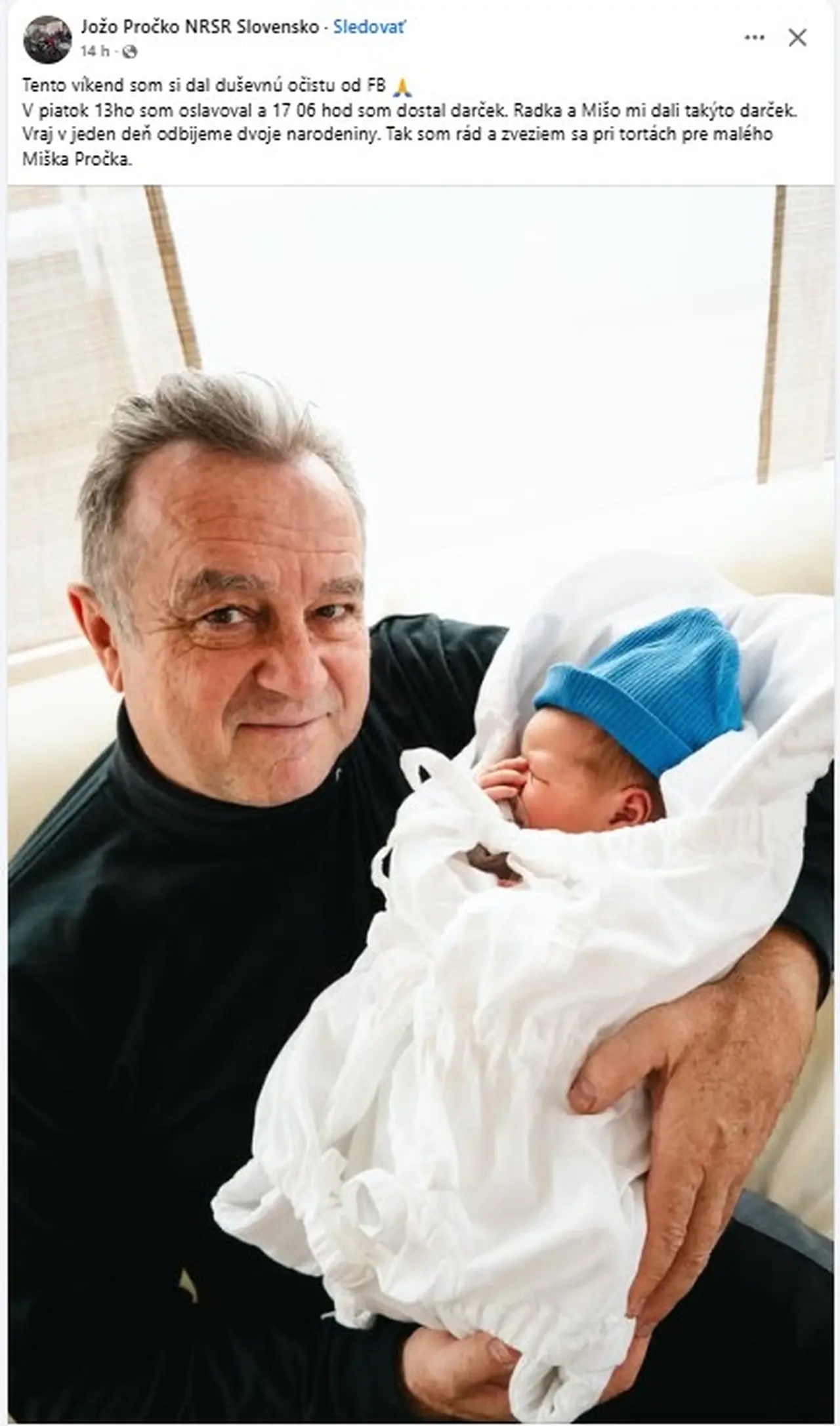 No práve tento víkend prišla krásna správa, ktorá rozžiarila jeho deň. Jožo sa stal dedkom a do rodiny prichádza nový člen – malý Miško Pročko. „V piatok 13. som oslavoval a o 17:06 som dostal darček. Radka a Mišo mi dali takýto darček. Vraj v jeden deň odbijeme dvoje narodeniny,“ napísal šťastný Jožo na sociálnych sieťach a zdieľal fotografiu so svojím vnukom.
