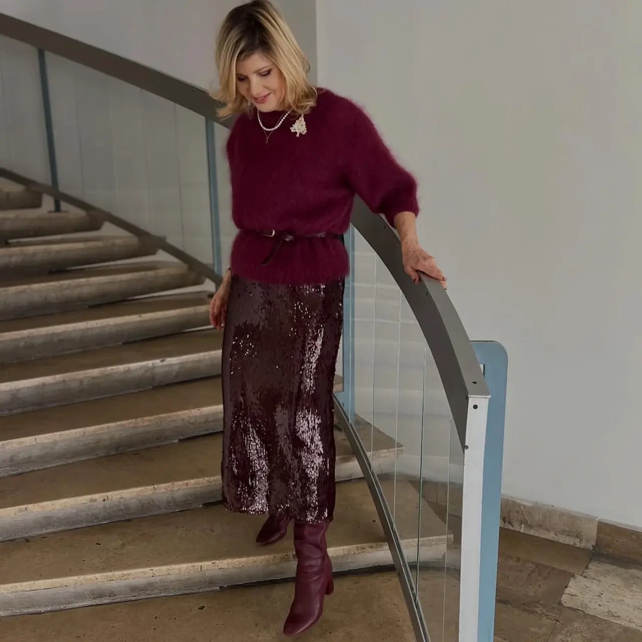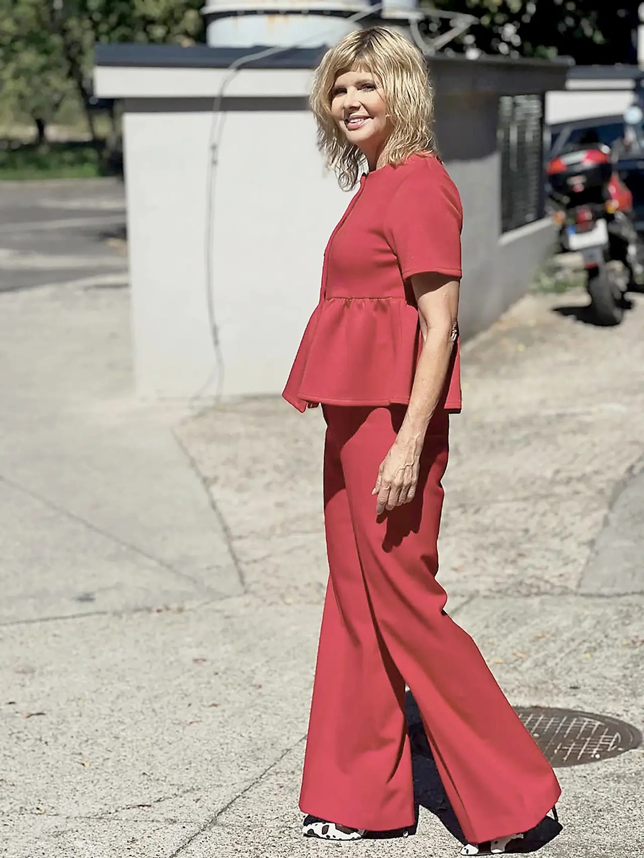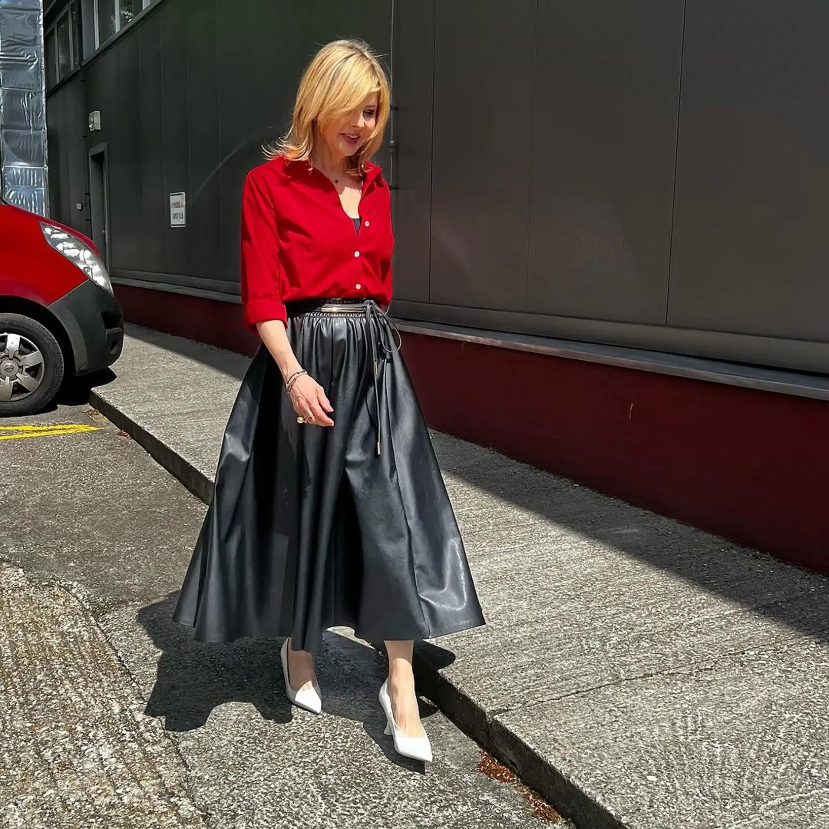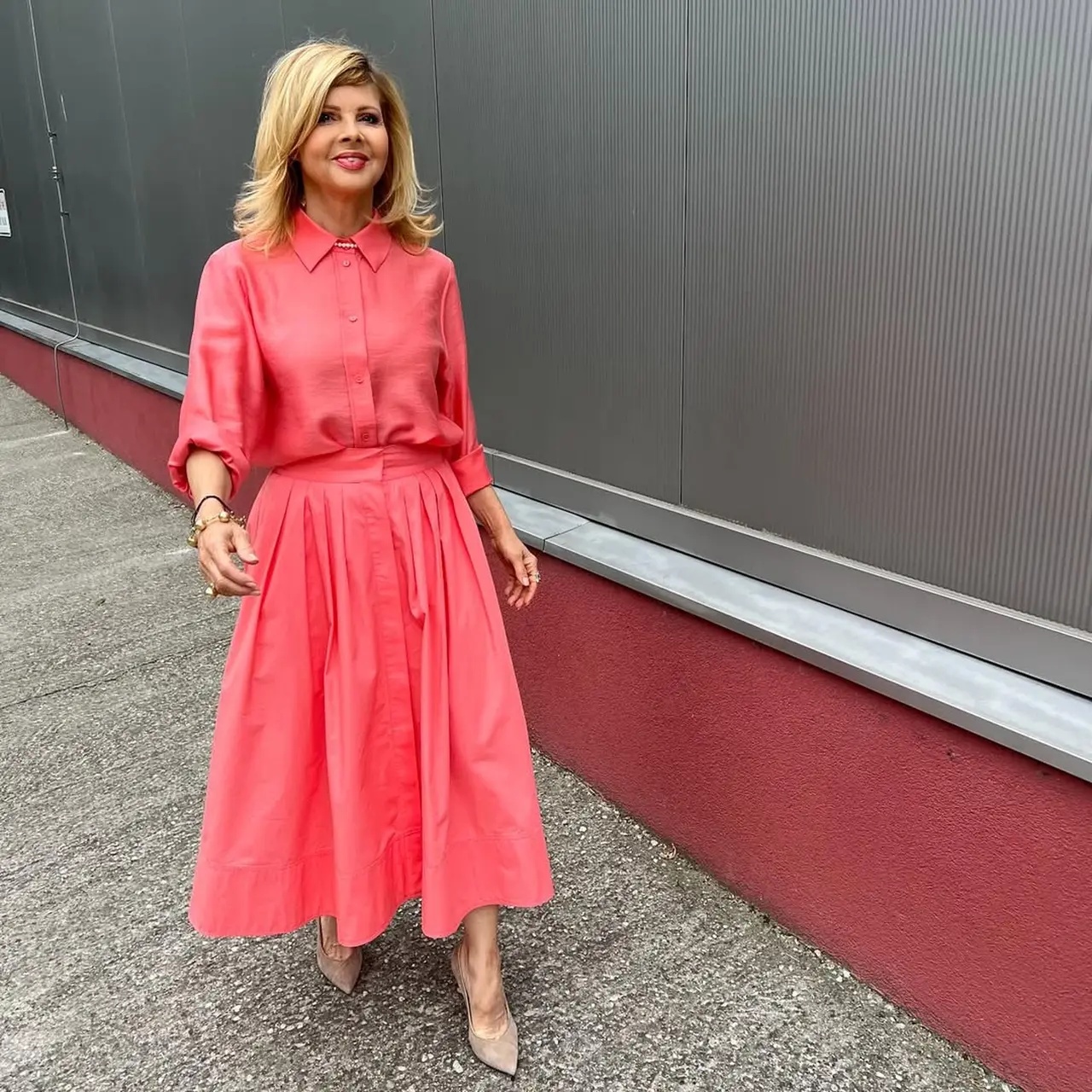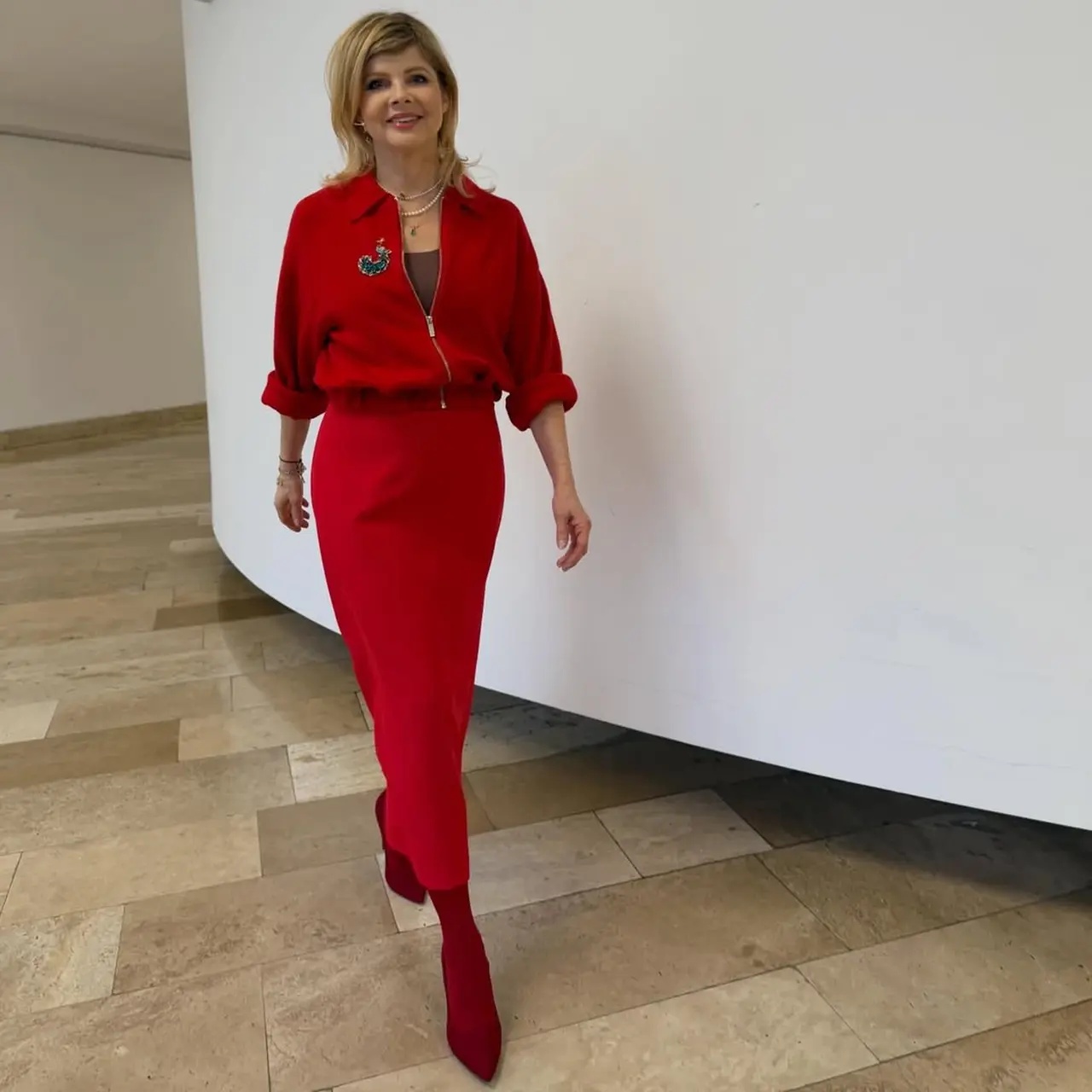 Často ju vidieť v kombináciách, kde červená hrá hlavnú rolu – dlhé sukne, výrazné doplnky, kabelky či dokonca celé outfity ladené od hlavy po päty. Práve táto odvaha je to, čo ju odlišuje od ostatných. Zatiaľ čo mnohé ženy v jej veku siahajú po tlmenejších farbách, Soňa ide presne opačnou cestou.