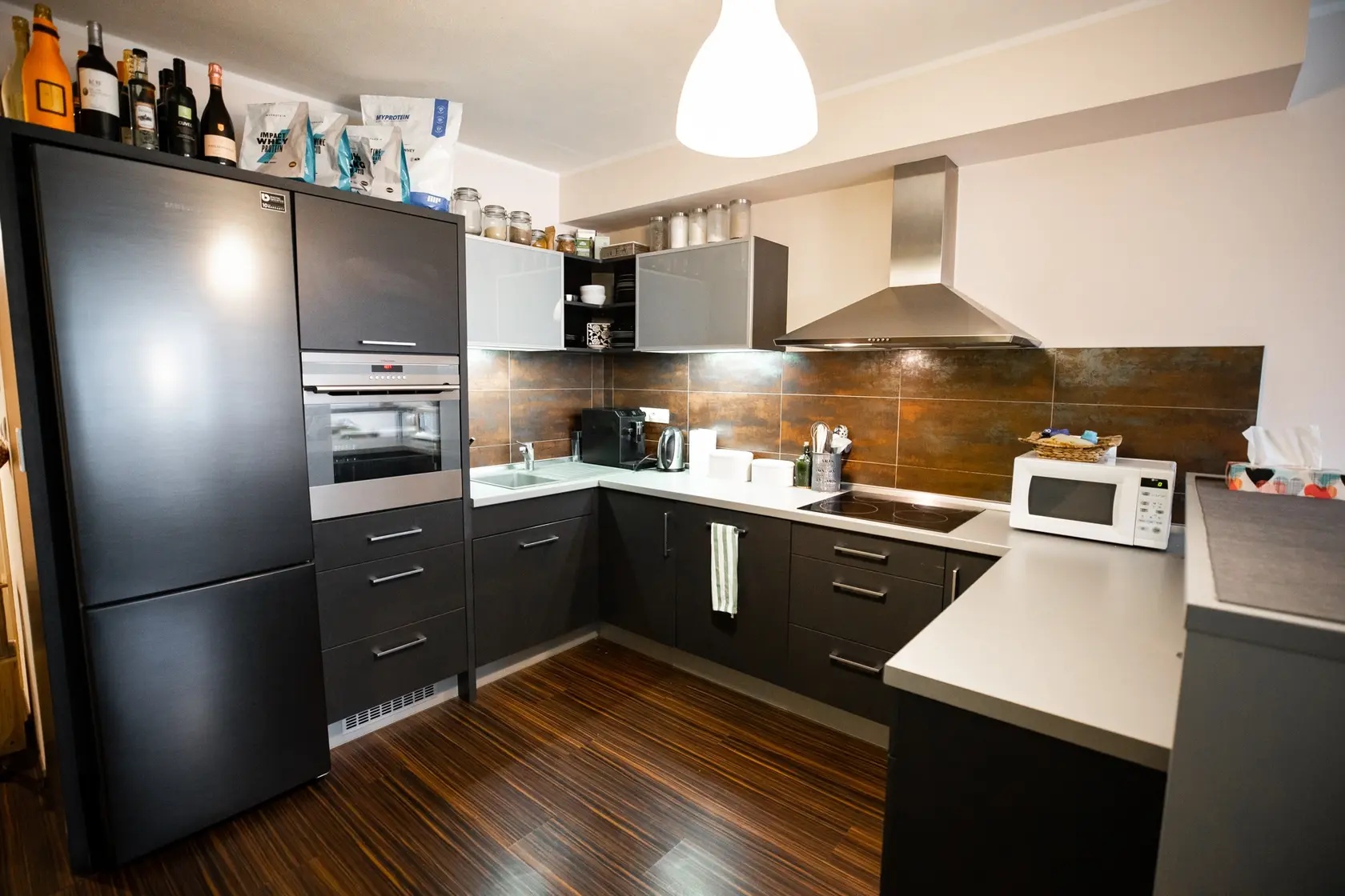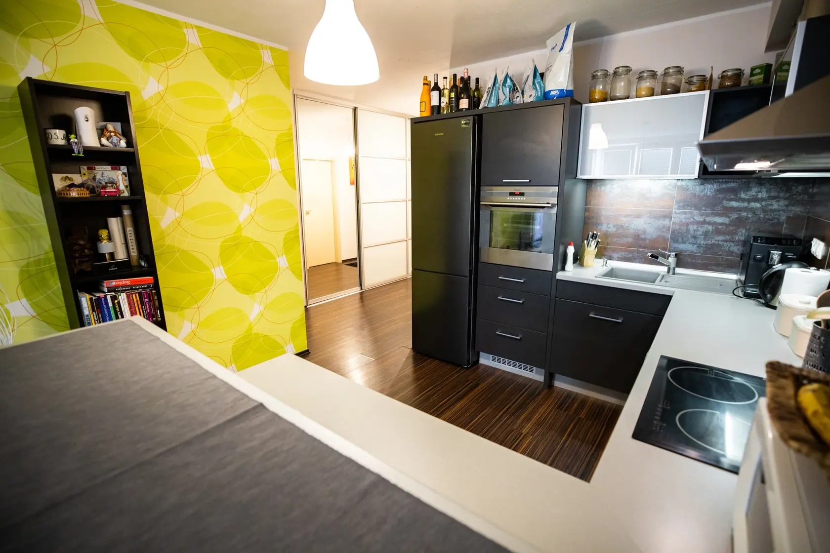 Celý byt pôsobí otvorene. Kuchyňa prechádza do obytného priestoru bez ostrých hraníc, čo vytvára pocit voľnosti. Aj napriek tmavším prvkom nepôsobí stiesnene – práve naopak.