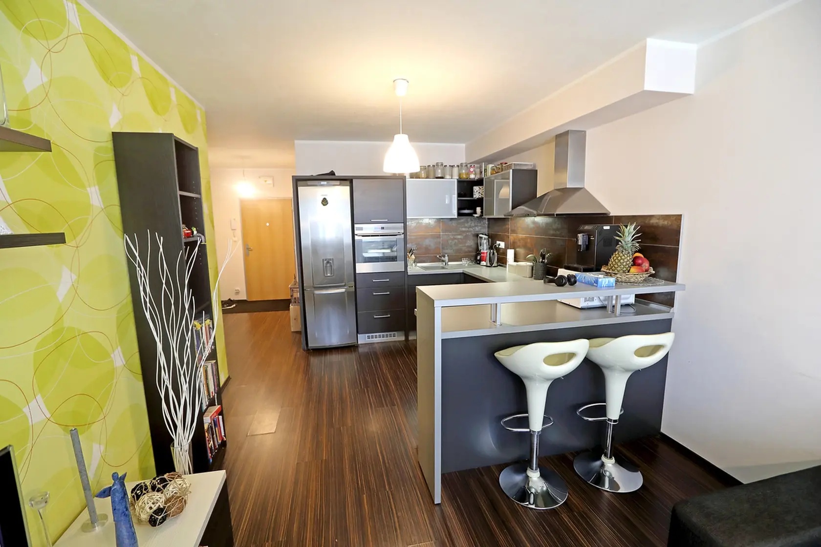 Biele barové stoličky pri pulte priestor odľahčia a dodajú mu mestský nádych. Je to detail, ktorý ukazuje, že nejde len o dizajn, ale o balans medzi praktickosťou a štýlom.