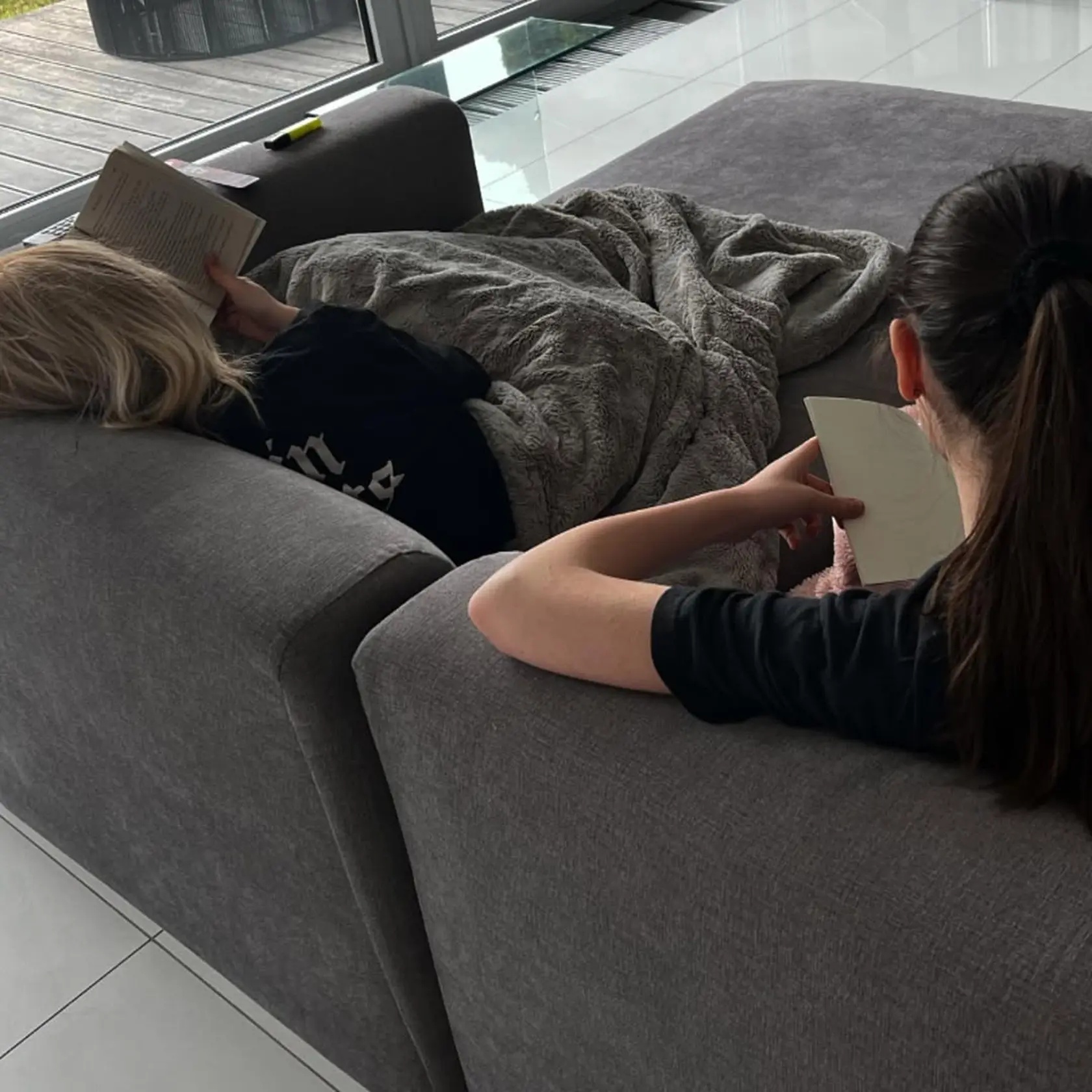 Na prvý pohľad ide o nenápadný moment – mama s dcérou na gauči, knihy v rukách, pokojná nedeľa. Lenže práve tento obraz odhalil priestor, ktorý pôsobí premyslene, štýlovo a bez zbytočného preháňania.