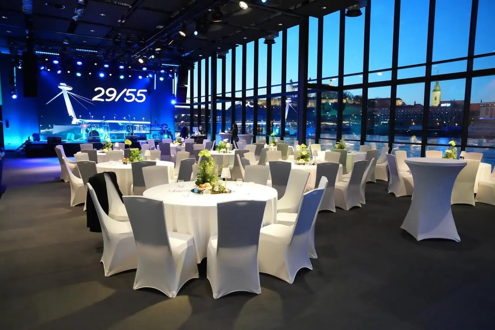Oslava sa konala v modernom priestore s presklenými stenami, ktoré poskytovali krásny výhľad na mesto. Ako sa deň menil na noc, priestor dostal úplne nový rozmer. Intímnejšia, ale stále elegantná atmosféra bola umocnená okrúhlymi stolmi, čistým prestieraním a decentnými dekoráciami. Hostia sa pohybovali voľne a vychutnávali si večer bez pocitu stiesnenosti.