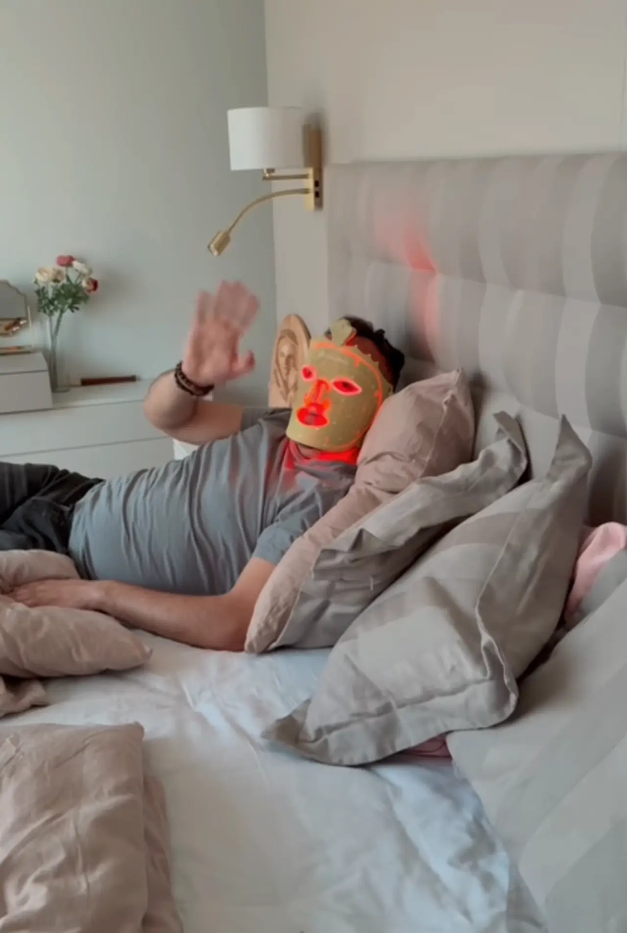 V spálni sa páru podarilo vytvoriť dokonalý pokoj. Moderná posteľ s mäkučkým čalúneným panelom zo štvorcov je zladená s dizajnom miestnosti. Nástenná lampička, ktorá zjednocuje dva zdroje svetla, okrúhle látkové tienidlo a flexibilné LED svetlo na čítanie, je šperkom, ktorý dotvára tento priestor.