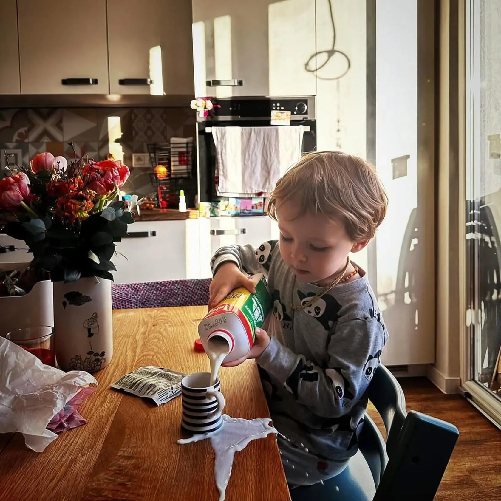 Dominantou je však veľký drevený stôl. Práve pri ňom sa odohrávajú momenty, ktoré sa nedajú naplánovať. Na jednej zo spomienok je jej syn Alan, ktorý si s detskou odvahou nalieva mlieko. Možno trochu rozleje, možno to nejde dokonale – no nikto ho za to nekritizuje.