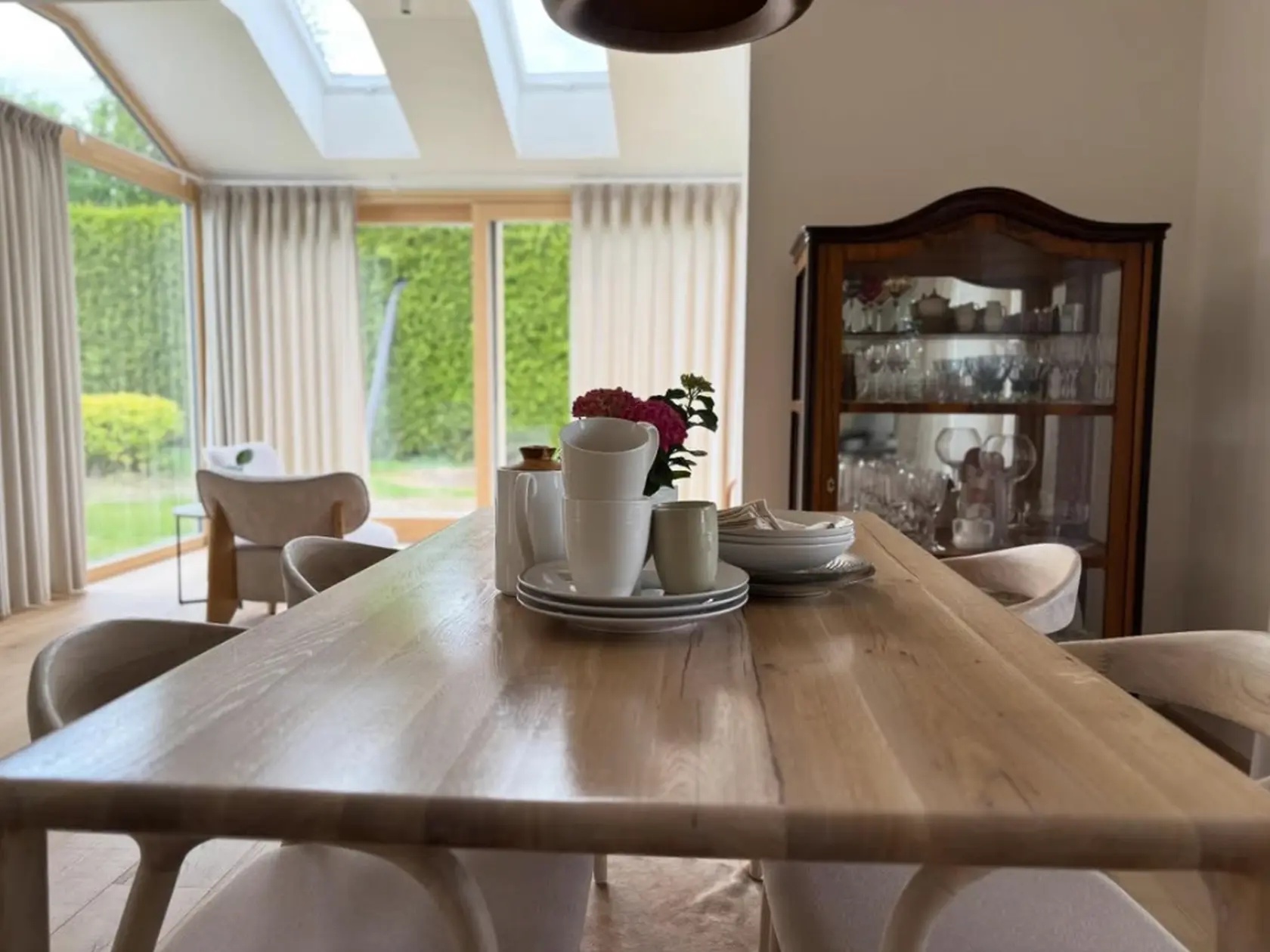 Jedálenský kút pôsobí pokojne a prirodzene. Drevený stôl, jednoduché riady, kvety ako nenápadný akcent. Veľké okná vpúšťajú dnu svetlo a otvárajú priestor smerom von. Všetko tu pôsobí uvoľnene, bez snahy zapôsobiť.
