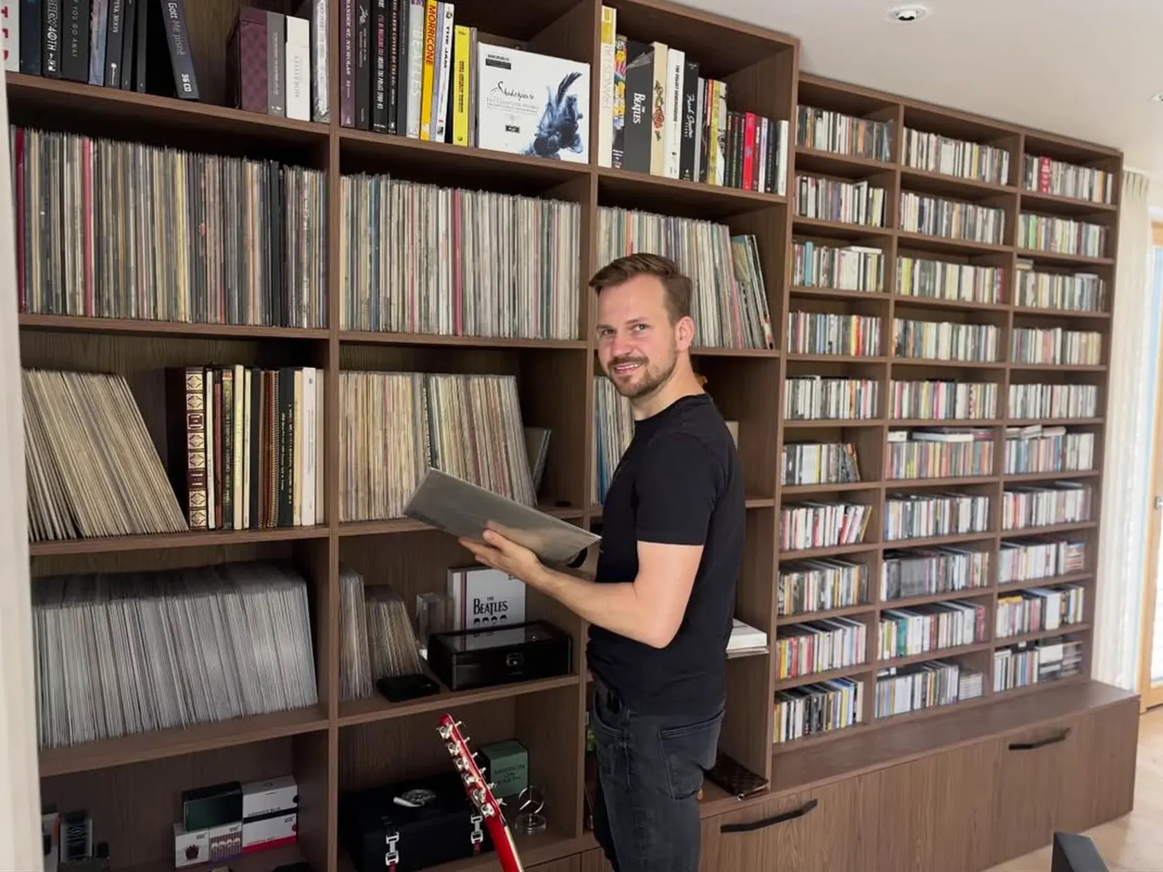 Najosobnejším miestom je však hudobný kútik. Poličky plné vinylov a CD prezrádzajú vášeň, ktorá ho sprevádza celý život. Gitara po ruke, albumy na dosah – je to priestor, kde sa môže zastaviť a vrátiť k tomu, čo ho definuje najviac. Nie ako verejná osoba, ale ako človek.